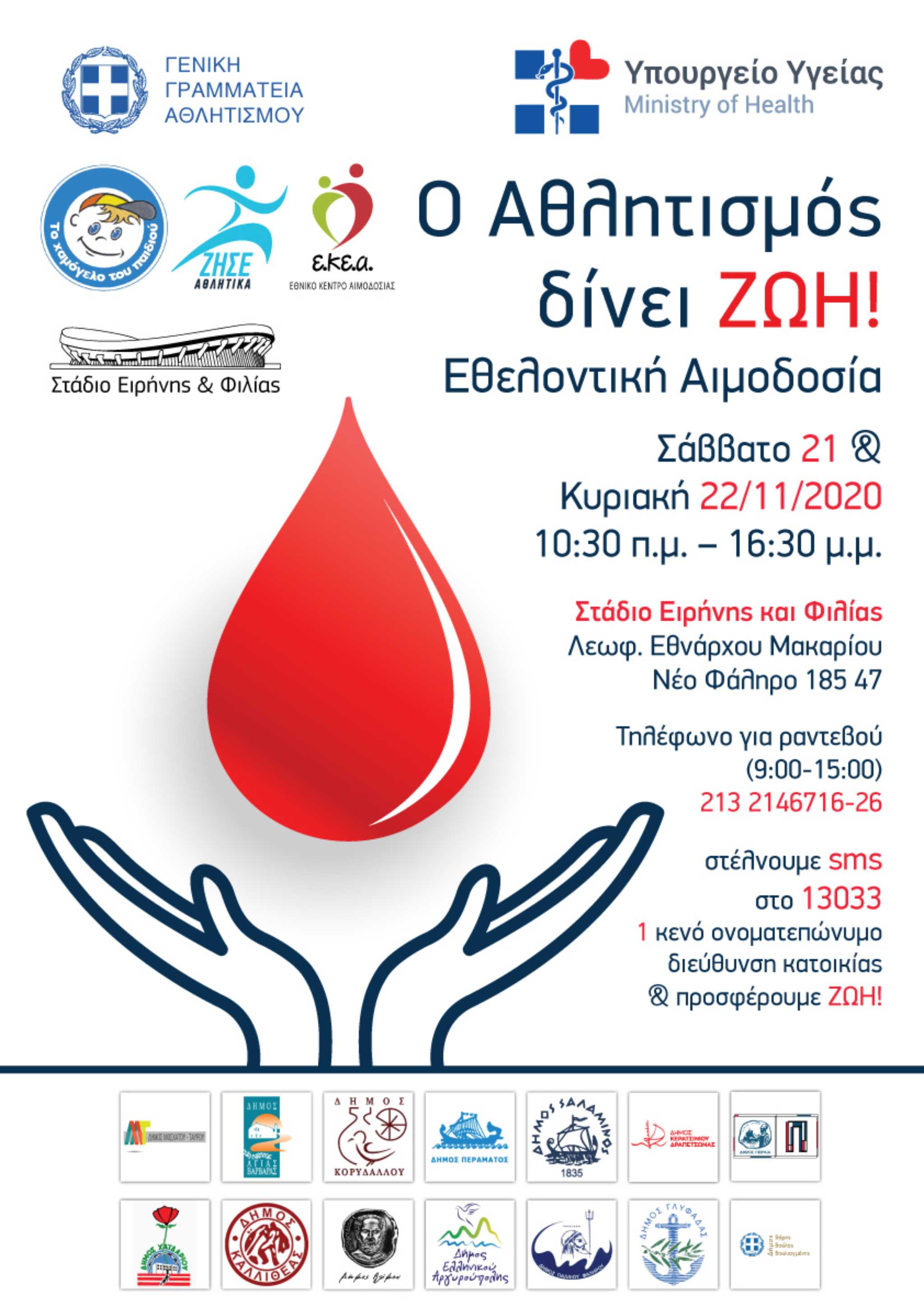 Το Σάββατο 21 και την Κυριακή 22 Νοεμβρίου και ώρες 10.30-16.30, θα πραγματοποιηθεί στο Στάδιο Ειρήνης και Φιλίας, εθελοντική αιμοδοσία, για την αντιμετώπιση των εποχιακών ελλείψεων αίματος, λόγω της πανδημίας COVID-19.