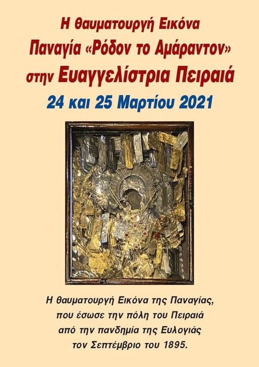 Εν όψει της μεγάλης εορτής του Ευαγγελισμού της Θεοτόκου, η θαυματουργή Εικόνα της Παναγίας «Ρόδον το Αμάραντον» θα τεθεί προς προσκύνηση στον πανηγυρίζοντα Ιερό Ναό Ευαγγελιστρίας Πειραιώς, από το πρωί της Τετάρτης 24 έως το απόγευμα της Πέμπτης 25 Μαρτίου, ημέρα της εορτής.