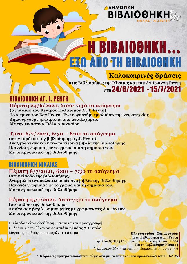 Τα κίτρινα βιβλία συναντούν τα ηλιοτρόπια του Βαν Γκογκ προσκαλώντας τα παιδιά να γνωρίσουν τη μαγεία του κίτρινου. Η Δημοτική Βιβλιοθήκη Νίκαιας-Αγ.Ι. Ρέντη διοργανώνει μια σειρά καλοκαιρινών δράσεων με γενικό τίτλο «Η Βιβλιοθήκη…έξω από τη Βιβλιοθήκη» στις 24 Ιουνίου, 6,8 και 15 Ιουλίου. Πιο συγκεκριμένα 24 Ιουνίου και 6 Ιουλίου οι δράσεις θα πραγματοποιηθούν αντίστοιχα στην αυλή του Κέντρου πολιτισμού Αγ.Ι. Ρέντη και στην ταράτσα της Βιβλιοθήκης Αγ.Ι. Ρέντη. Στις 8 και 15 Ιουλίου στην είσοδο και στο αίθριο της Βιβλιοθήκης Νίκαιας.