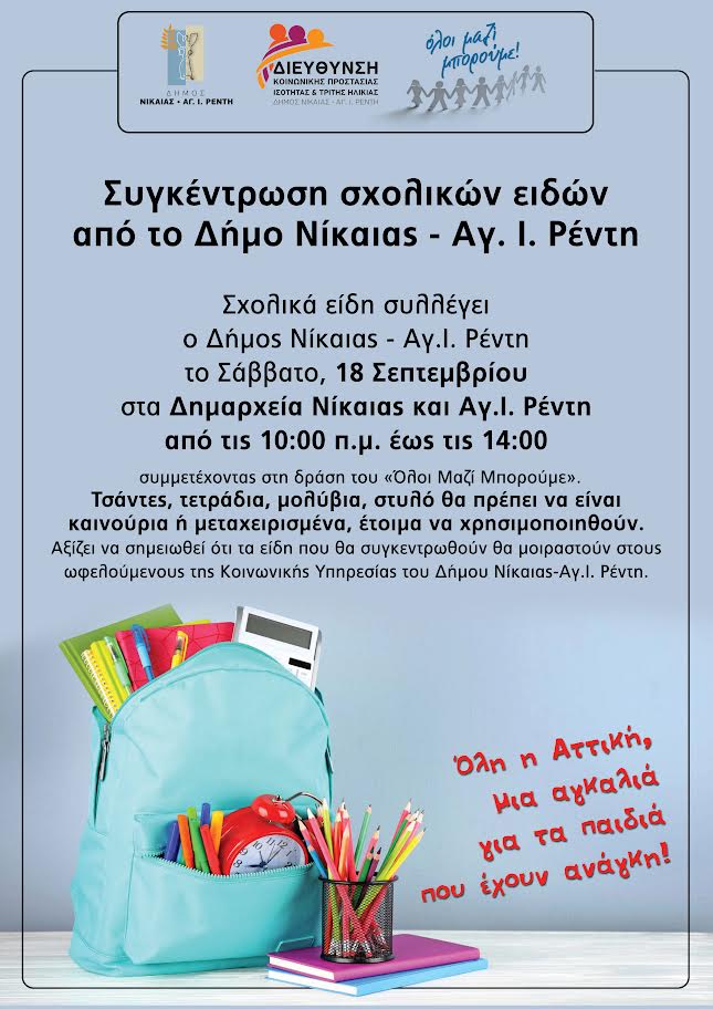 Σχολικά είδη συλλέγει ο Δήμος Νίκαιας-Αγ.Ι. Ρέντη το Σάββατο, 18 Σεπτεμβρίου στα Δημαρχεία Νίκαιας και Αγ.Ι. Ρέντη από τις 10.00 π.μ.-14.00 συμμετέχοντας στη δράση του «Όλοι Μαζί Μπορούμε».Τσάντες, τετράδια, μολύβια, στυλό θα πρέπει να είναι καινούρια ή μεταχειρισμένα, έτοιμα να χρησιμοποιηθούν. Αξίζει να σημειωθεί ότι τα είδη που θα συγκεντρωθούν θα μοιραστούν στους ωφελούμενους της Κοινωνικής υπηρεσίας του Δήμου Νίκαιας-Αγ.Ι. Ρέντη.