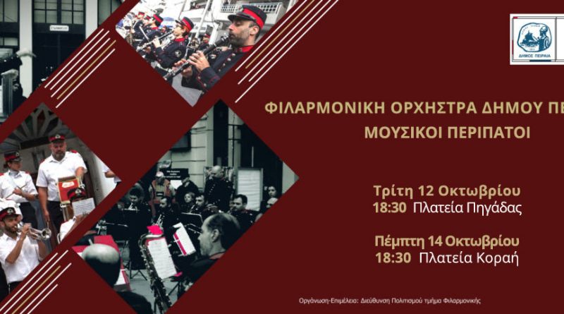 Η Φιλαρμονική Ορχήστρα του Δήμου Πειραιά συνεχίζει τους μουσικούς περιπάτους  στις γειτονιές της πόλης,  όπου  οι  μουσικοί της Φιλαρμονικής με  γνωστές μελωδίες θα ψυχαγωγήσουν τους δημότες και  τους επισκέπτες.
