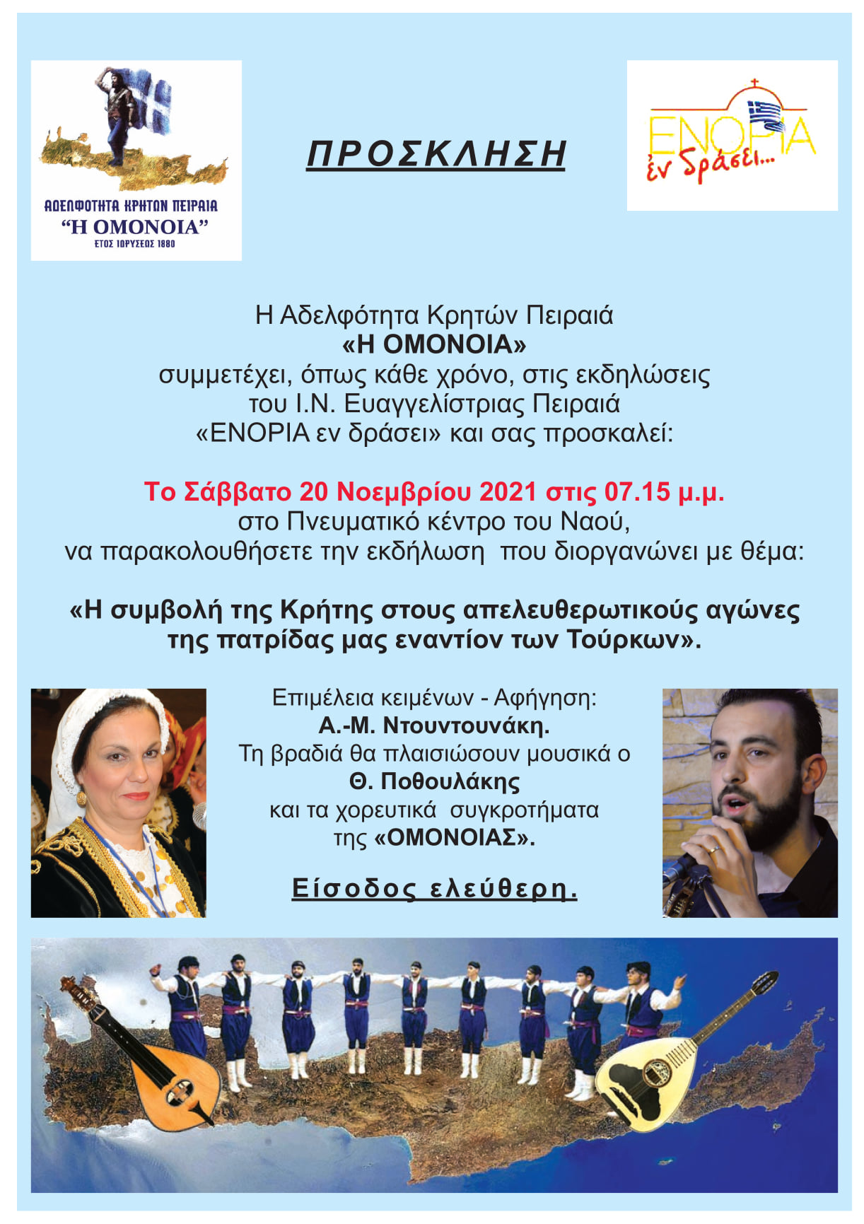 Η Αλεφότητα Κρητών Πειραιά “Η ΟΜΟΝΟΙΑ” συμμετέχει, ‘οπως κάθε χρόνο, στις εκδηλώσεις του Ι. Ν. Ευαγγελίστριας Πειραιά “ΕΝΟΡΙΑ εν δράσει” και σας προσκαλεί