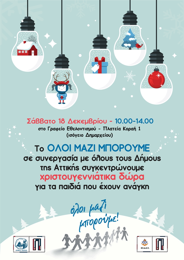 Ο Δήμος Πειραιά και η ΚΟ.Δ.Ε.Π., συμμετέχουν στην καθιερωμένη δράση του «Όλοι Μαζί Μπορούμε» για τη συλλογή Χριστουγεννιάτικων δώρων, τα οποία θα διανεμηθούν στα ωφελούμενα παιδιά της ΚΟ.Δ.Ε.Π..