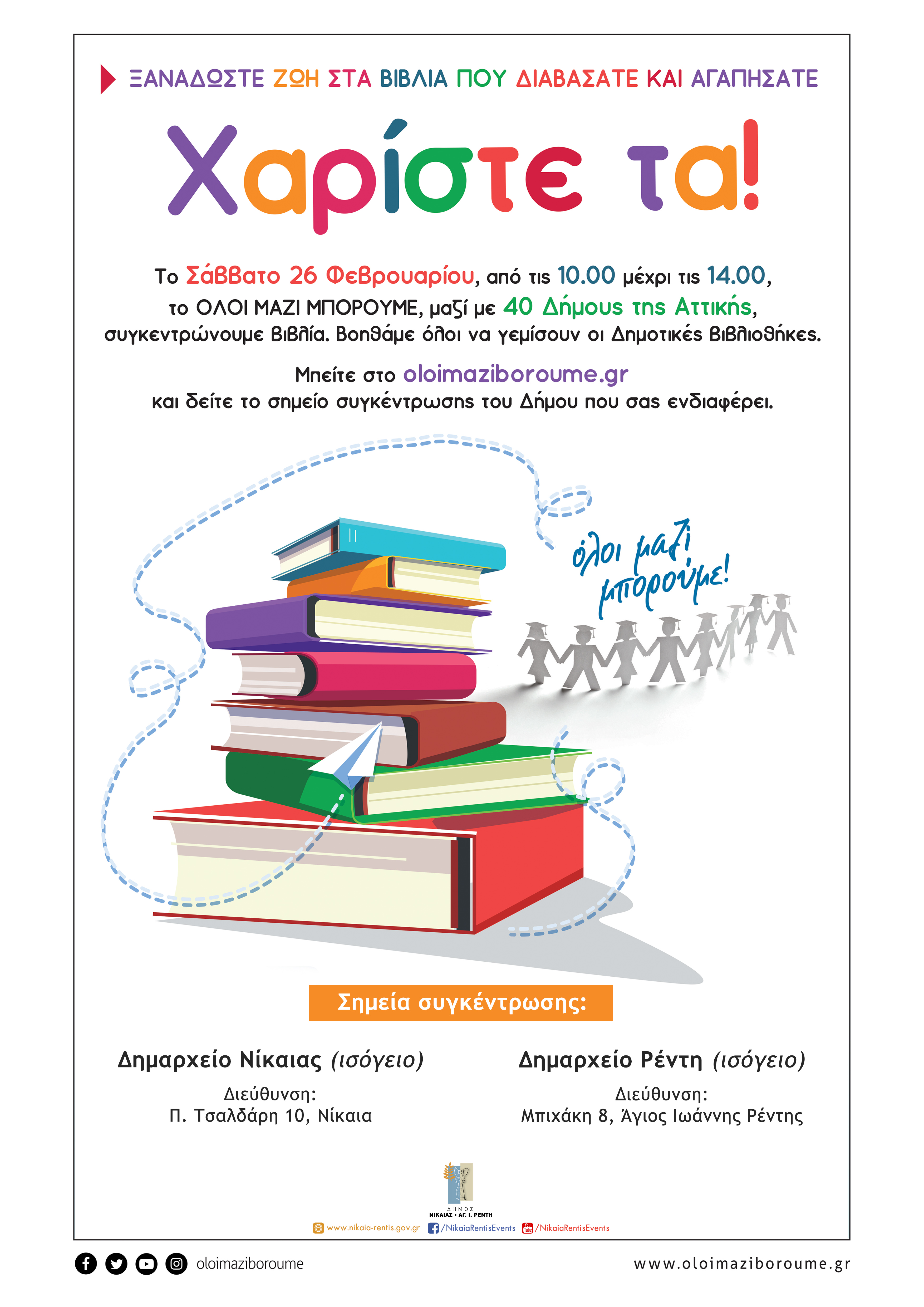 Με κεντρικό σύνθημα «Χαρίστε τα!» ο Δήμος Νίκαιας-Αγ.Ι. Ρέντη συμμετέχει στη δράση του ΟΛΟΙ ΜΑΖΙ ΜΠΟΡΟΥΜΕ και συγκεντρώνει λογοτεχνικά βιβλία. Η δράση θα πραγματοποιηθεί το Σάββατο 26 Φεβρουαρίου στα Δημαρχεία Νίκαιας (Π.Τσαλδάρη 10, ισόγειο) και Ρέντη (Μπιχάκη 8) από τις 10 το πρωί έως τις 2 το μεσημέρι. Μ’αυτό τον τρόπο, μικροί και μεγάλοι μπορούν να δώσουν ξανά ζωή στα βιβλία που διάβασαν και αγάπησαν ενισχύοντας τις δημοτικές και κοινωνικές βιβλιοθήκες.