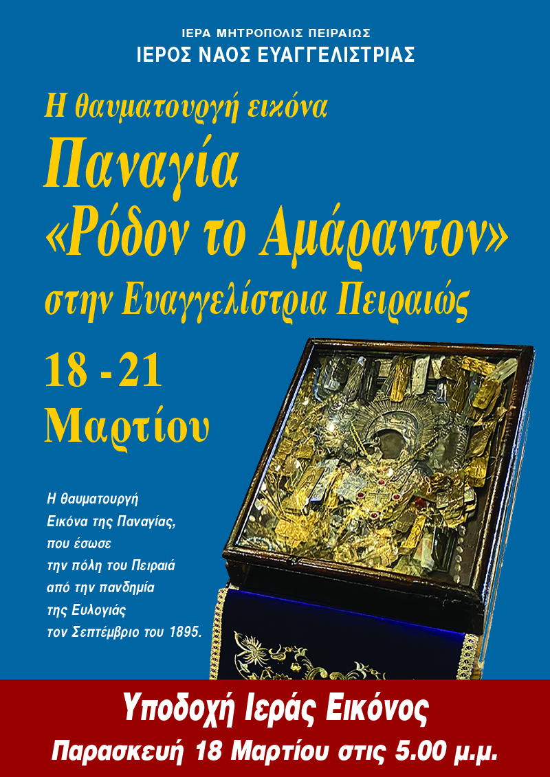Την θαυματουργή εικόνα της Παναγίας «Ρόδον το Αμάραντον» θα υποδεχθεί ο Ιερός Ναός Ευαγγελιστρίας Πειραιώς την Παρασκευή 18 Μαρτίου στις 5 το απόγευμα.