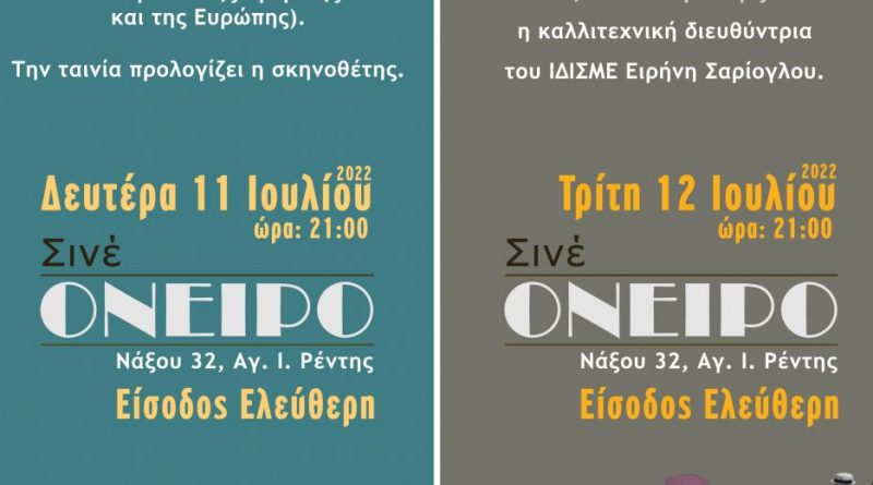 Στο πλαίσιο των εκδηλώσεων τιμής και μνήμης για τα 100 χρόνια από τη Μικρασιατική Καταστροφή που διοργανώνει ο Δήμος Νίκαιας-Αγ. Ι. Ρέντη στις 11 και 12 Ιουλίου και ώρα 9.00 μ.μ. θα προβληθούν αντίστοιχα τα ντοκιμαντέρ «Σμύρνη, η Καταστροφή μιας Κοσμοπολίτικης Πόλης 1900-1922» και «Η Ανατολή έδυσε»  στο Σινέ Όνειρο (Νάξου 32, Ρέντης).
