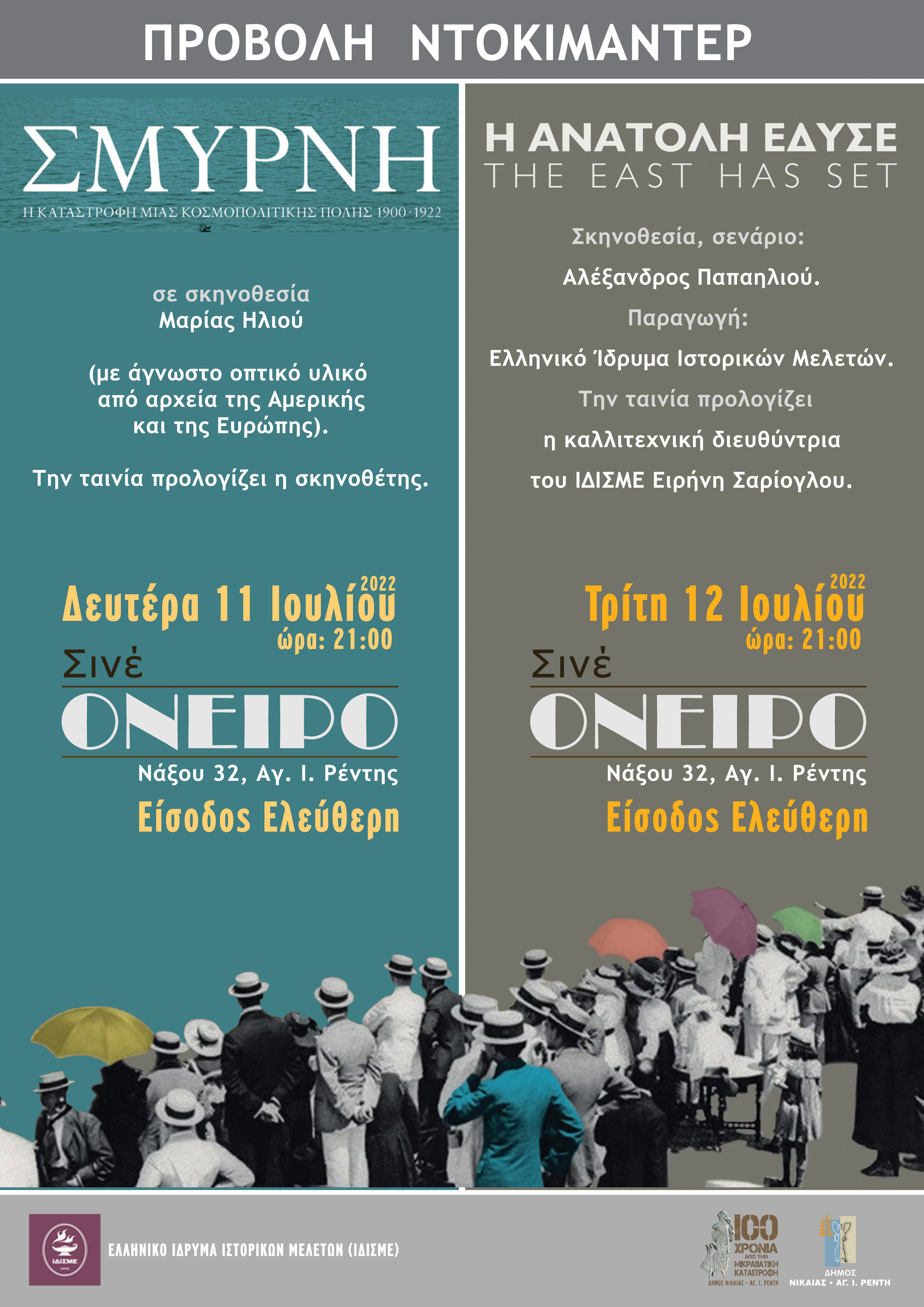 Την Τρίτη 12 Ιουλίου το Ελληνικό Ίδρυμα Ιστορικών Μελετών (ΙΔΙΣΜΕ) θα παρουσιάσει το ντοκιμαντέρ «Η Ανατολή έδυσε». Η σκηνοθεσία και το σενάριο είναι του Αλέξανδρου Παπαηλιού και την ταινία προλογίζει η καλλιτεχνική διευθύντρια του ΙΔΙΣΜΕ Ειρήνη Σαρίογλου. Η μουσική είναι του Γιάννη Βοργία και η αφήγηση του Γιώργου Κέντρου.