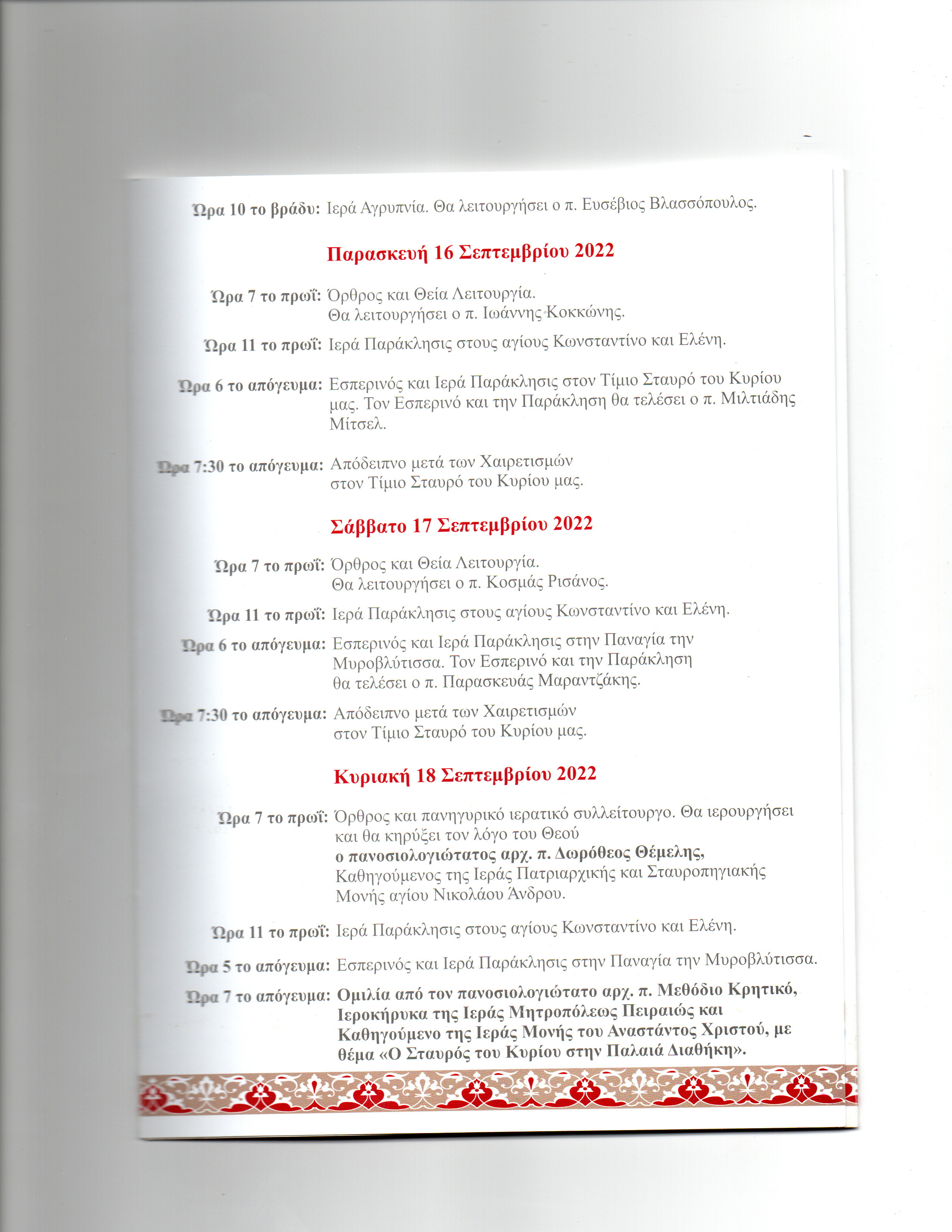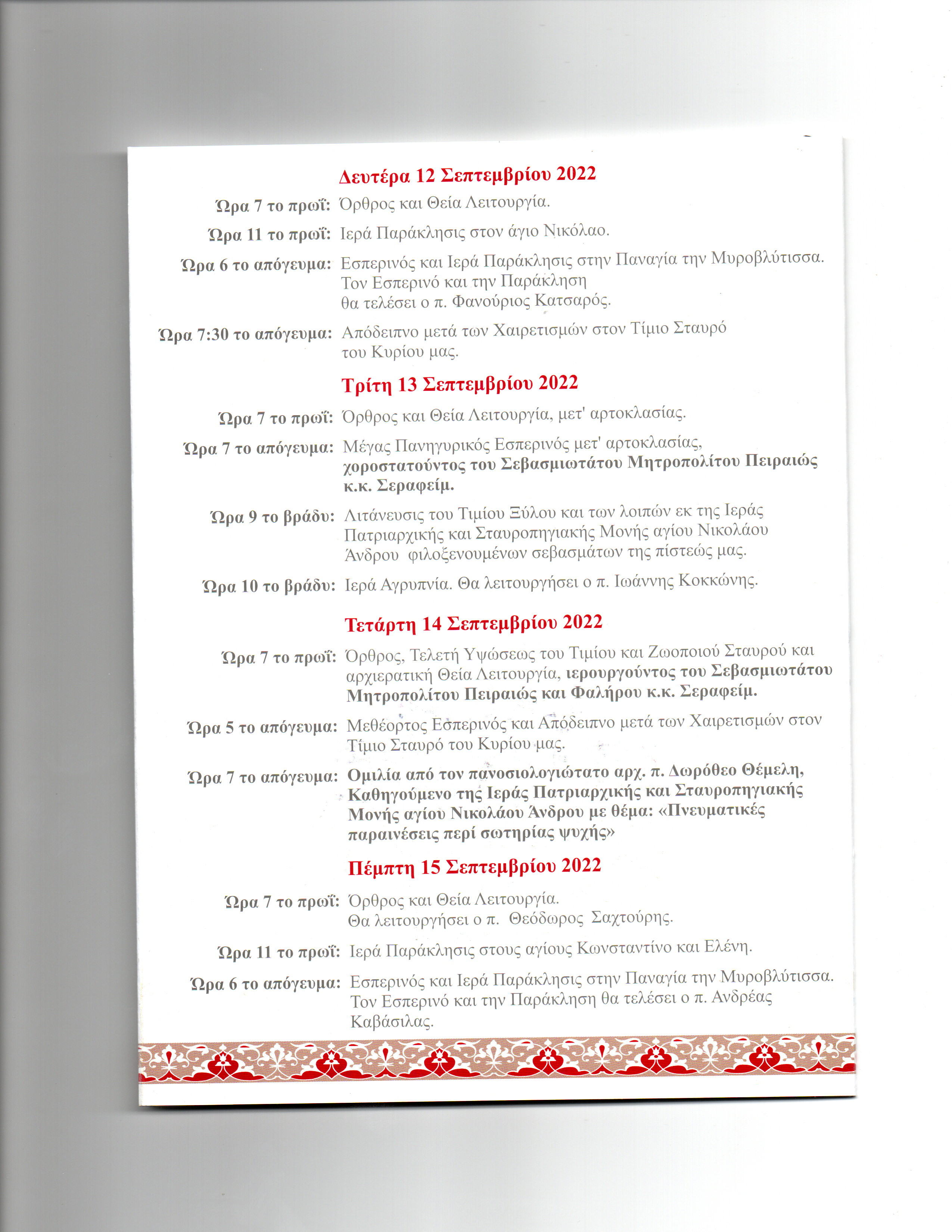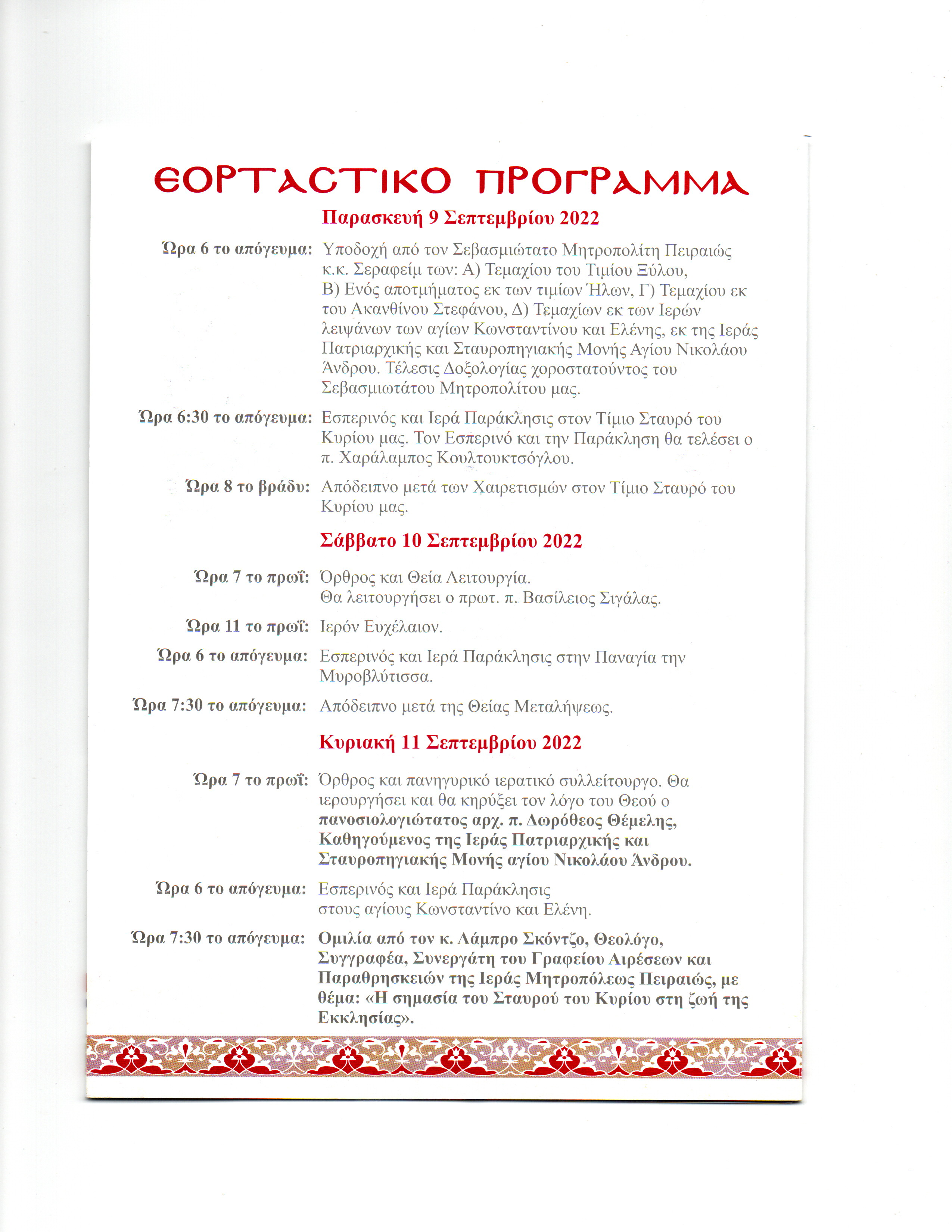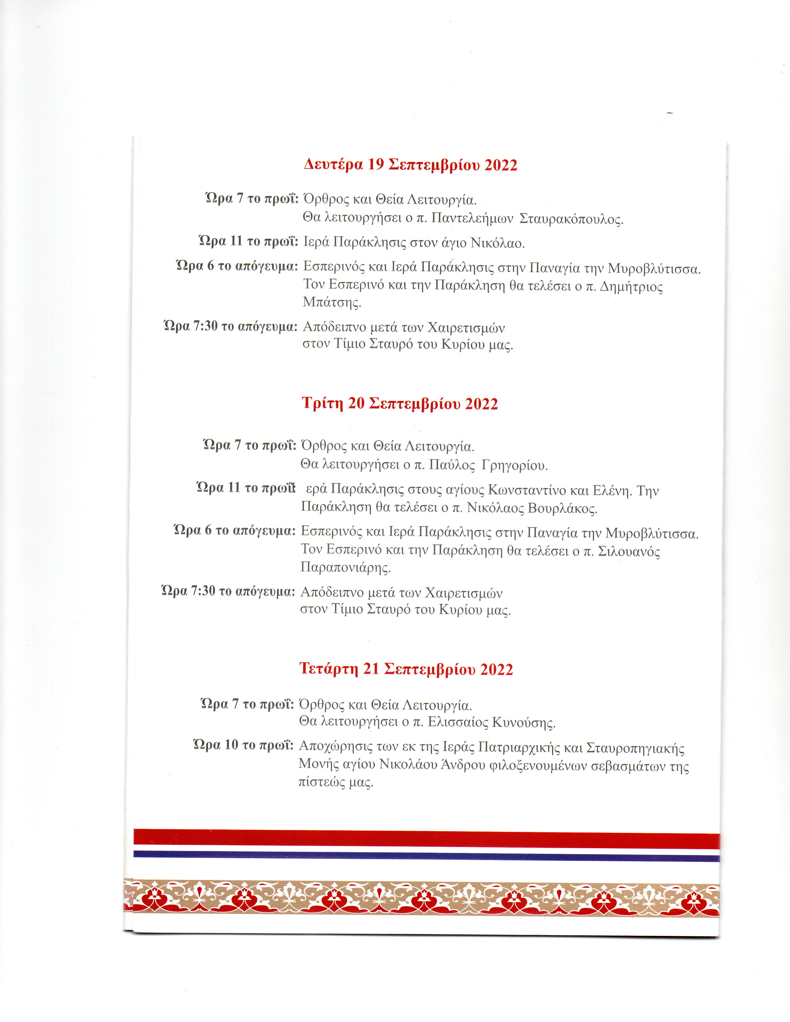 Με ιδιαίτερη τιμή σας παροσκαλούμε στις εορταστικές και λατρευτικές εκδηλώσεις που διοργανώνει η Ενορία μας με την ευκαιρία της αφίξεως και παραμονής του εκ της Ιεράς Πατριαρχικής και Σταυροπηγιακής Μονής Αγίου Νικολάου Άνδρου φιλοξενουμένων σεβασμάτων της πίστεώς μας, από 9ης έως και 21ης Σεπτεμβρίου 2022.