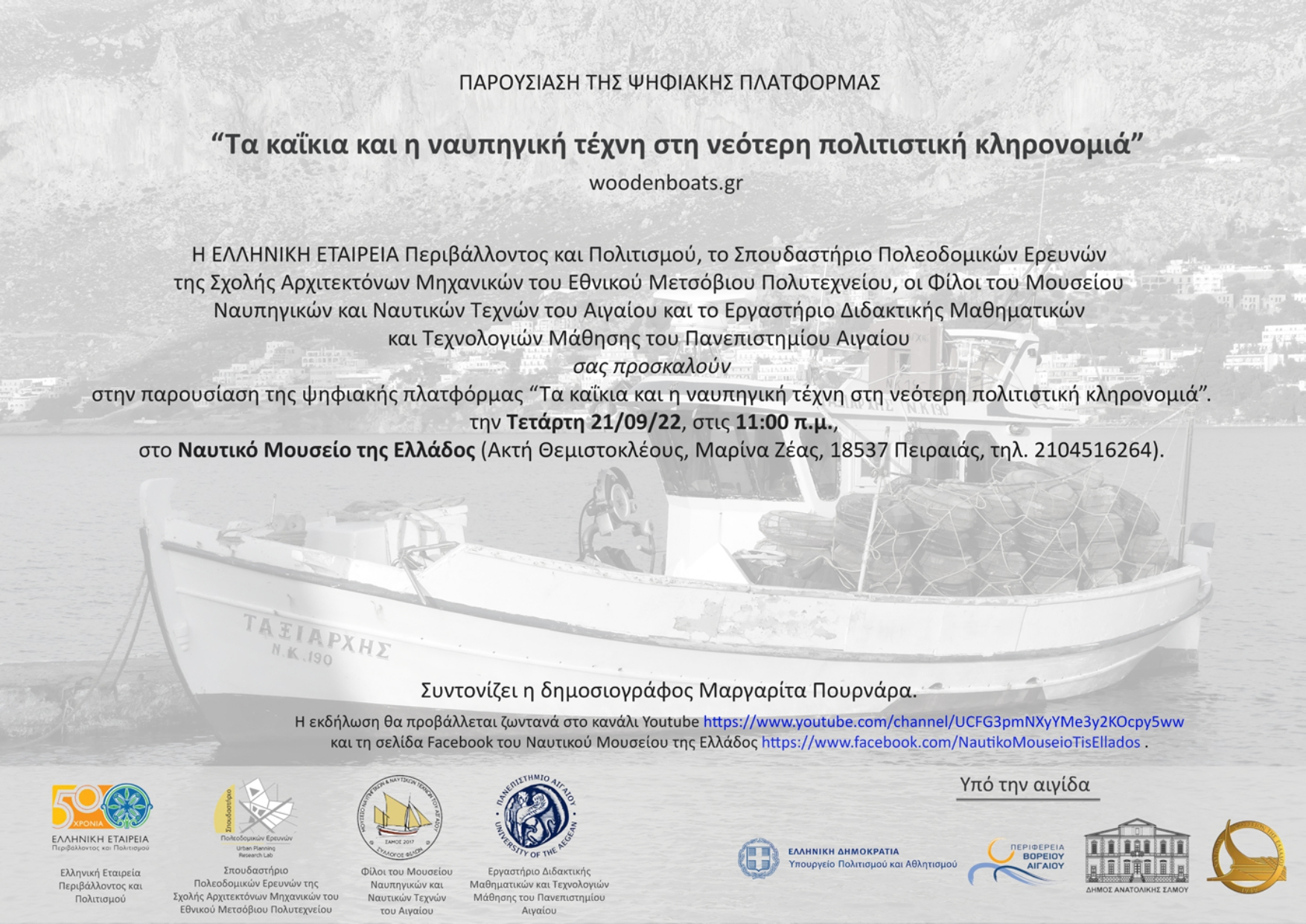 Ο Σύλλογος Φίλων του Μουσείου Ναυπηγικών και Ναυτικών Τεχνών του Αιγαίου, η ΕΛΛΗΝΙΚΗ ΕΤΑΙΡΕΙΑ Περιβάλλοντος και Πολιτισμού, το Σπουδαστήριο Πολεοδομικών Ερευνών της Σχολής Αρχιτεκτόνων του ΕΜΠ και το Εργαστήριο Διδακτικής Μαθηματικών και Τεχνολογιών Μάθησης του Πανεπιστημίου Αιγαίου παρουσιάζουν την ψηφιακή πλατφόρμα «Τα Καΐκια και η Ναυπηγική Τέχνη στη Νεότερη Πολιτιστική Κληρονομιά» (https://woodenboats.gr/).