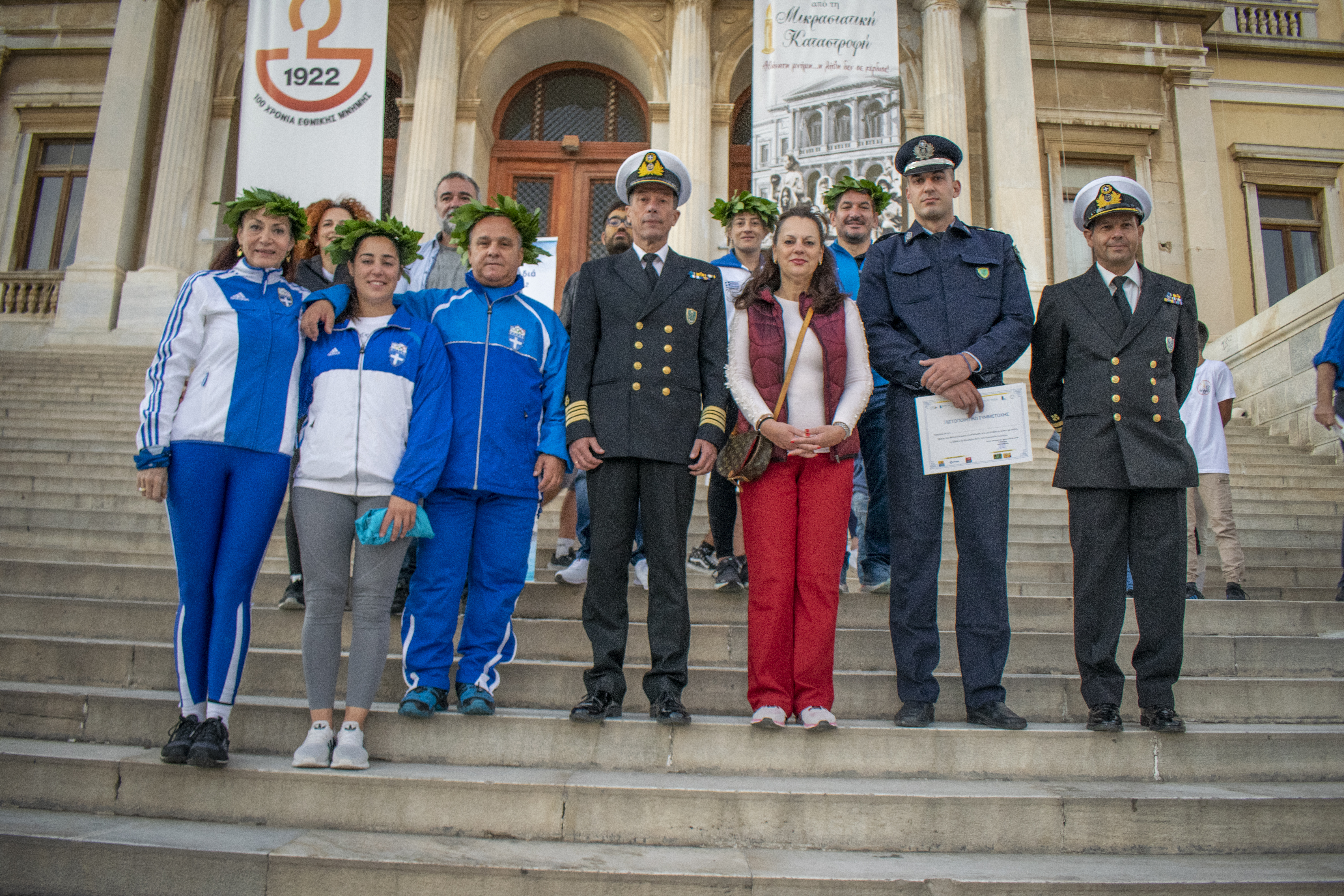 Με την Ελληνική σημαία και υπό τον Ολυμπιακό ύμνο κατέληξαν στην κεντρική πλατεία όπου και στεφανώθηκαν οι μεγάλοι αθλητές.
