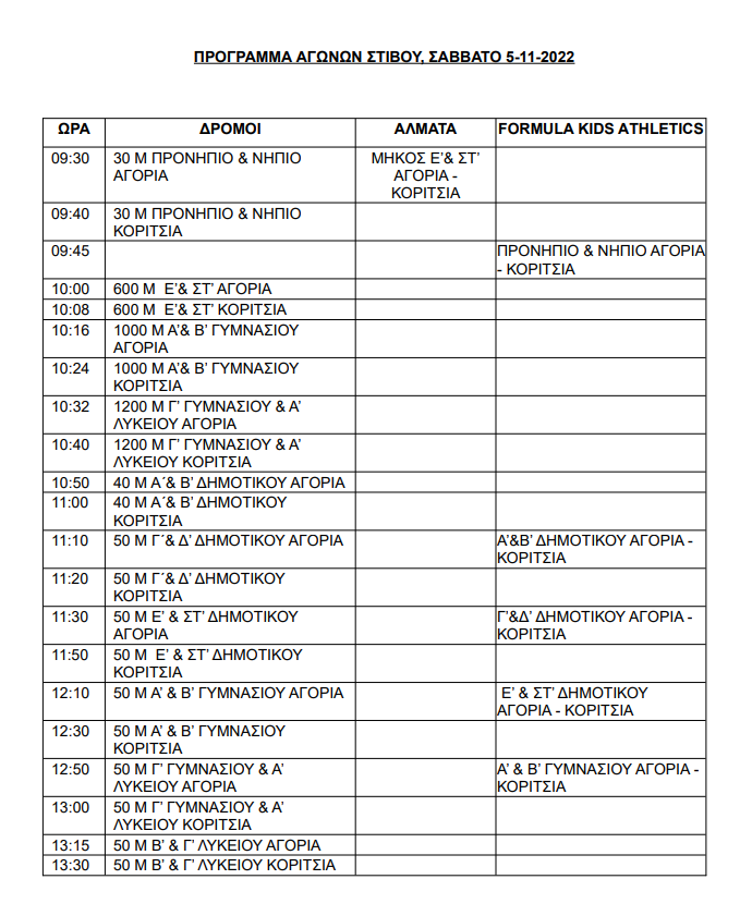 Οι αγώνες θα διεξαχθούν ανάλογα με την ηλικία και το φύλο σύμφωνα με το ακόλουθο πρόγραμμα, και θα ισχύσουν οι κανονισμοί στίβου του ΣΕΓΑΣ και της World Athletics 2021-2022.