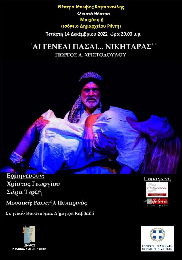 Το έργο του θεατρικού συγγραφέα Γιώργου Α. Χριστοδούλου «Αι γενεαί πάσαι…Νικηταράς» ανεβαίνει στο θέατρο «Ιάκωβος Καμπανέλλης» (ισόγειο Δημαρχείου Ρέντη) την Τετάρτη 14 Δεκεμβρίου στις 8 μ.μ. Το έργο διαπραγματεύεται τη ζωή του Νικήτα Σταματελόπουλου που έδωσε τόσες μάχες, έσπασε τρια σπαθιά στα Δερβενάκια και δεν καταδέχθηκε ποτέ να πάρει λάφυρα.