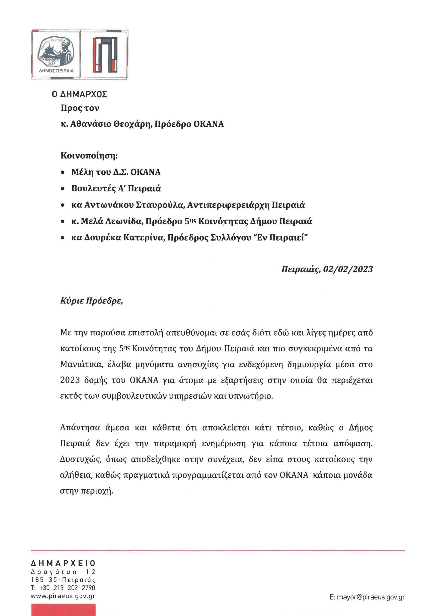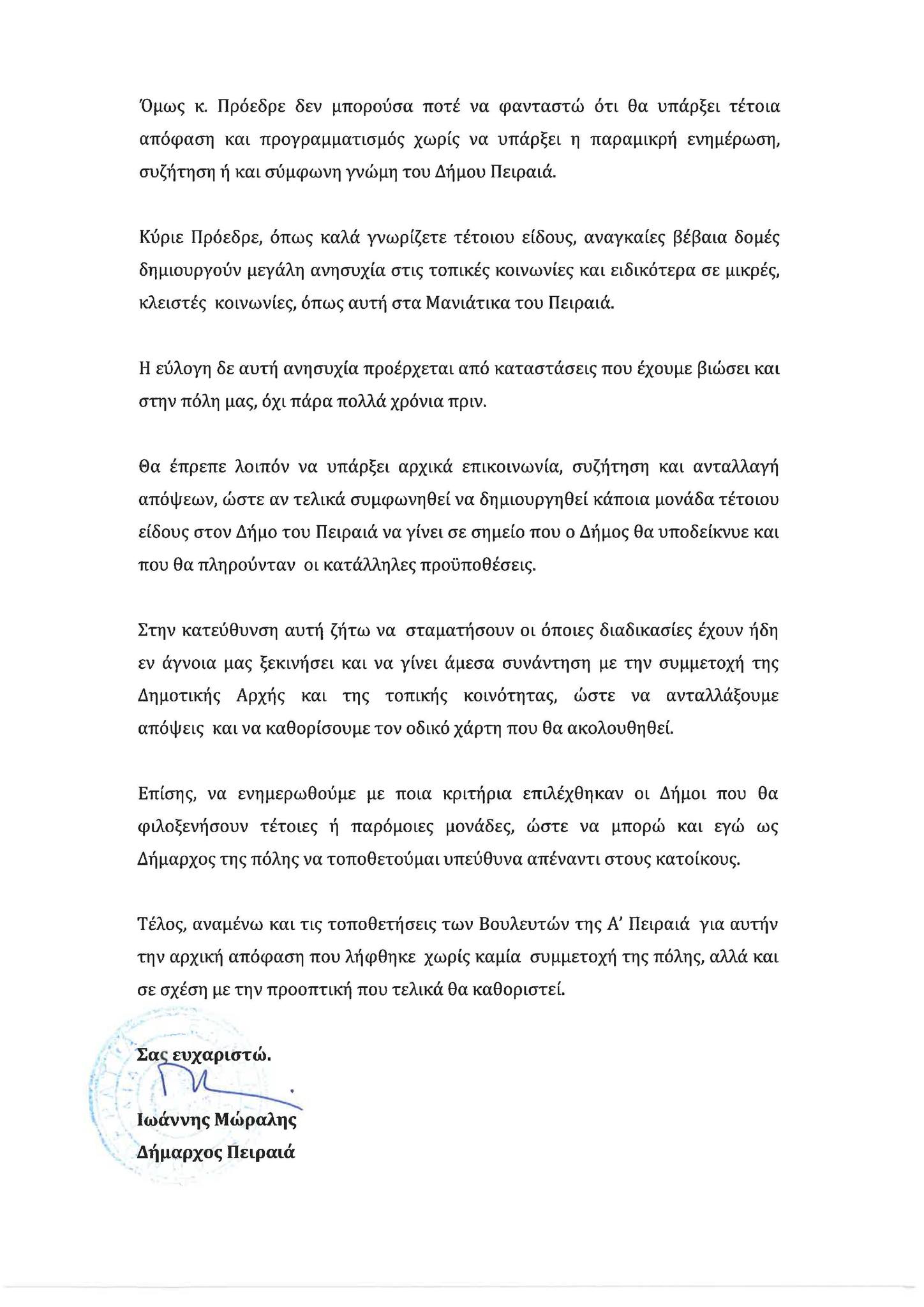 Ο Δήμαρχος του Πειραιά και κατ΄ επέκταση το Δημοτικό Συμβούλιο της πόλης πρέπει να ενημερώνεται για κάθε Δημόσια δομή που ο οποιοσδήποτε επιθυμεί να εγκαταστήσει στην πόλη πολύ νωρίτερα, ώστε να υπάρχει ο αναγκαίος χρόνος το θέμα να συζητηθεί στο Δημοτικό Συμβούλιο και την τοπική κοινότητα, προκειμένου να καθοριστεί ανοιχτά και δημοκρατικά η θέση της πόλης την οποία εκφράζει η Δημοτική Αρχή.
