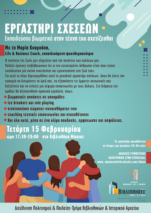 Εργαστήρι Σχέσεων «Εκπαιδεύσου βιωματικά στην τέχνη του σχετίζεσθαι» διοργανώνει η Δημοτική Βιβλιοθήκη Νίκαιας στο πλαίσιο των ετήσιων δράσεων της. Το εργαστήρι θα πραγματοποιηθεί την Τετάρτη 15 Φεβρουαρίου από τις 5.30 μ.μ-8.00 μ.μ. στο χώρο της βιβλιοθήκης (Αρκαδίου 23). Τον συντονισμό έχει αναλάβει η κ. Μαρία Κουρούπη (ψυχοπαιδαγωγός, life & business coach και εκπαιδευόμενη ψυχοθεραπεύτρια), η οποία θα εστιάσει στους παρακάτω στόχους: