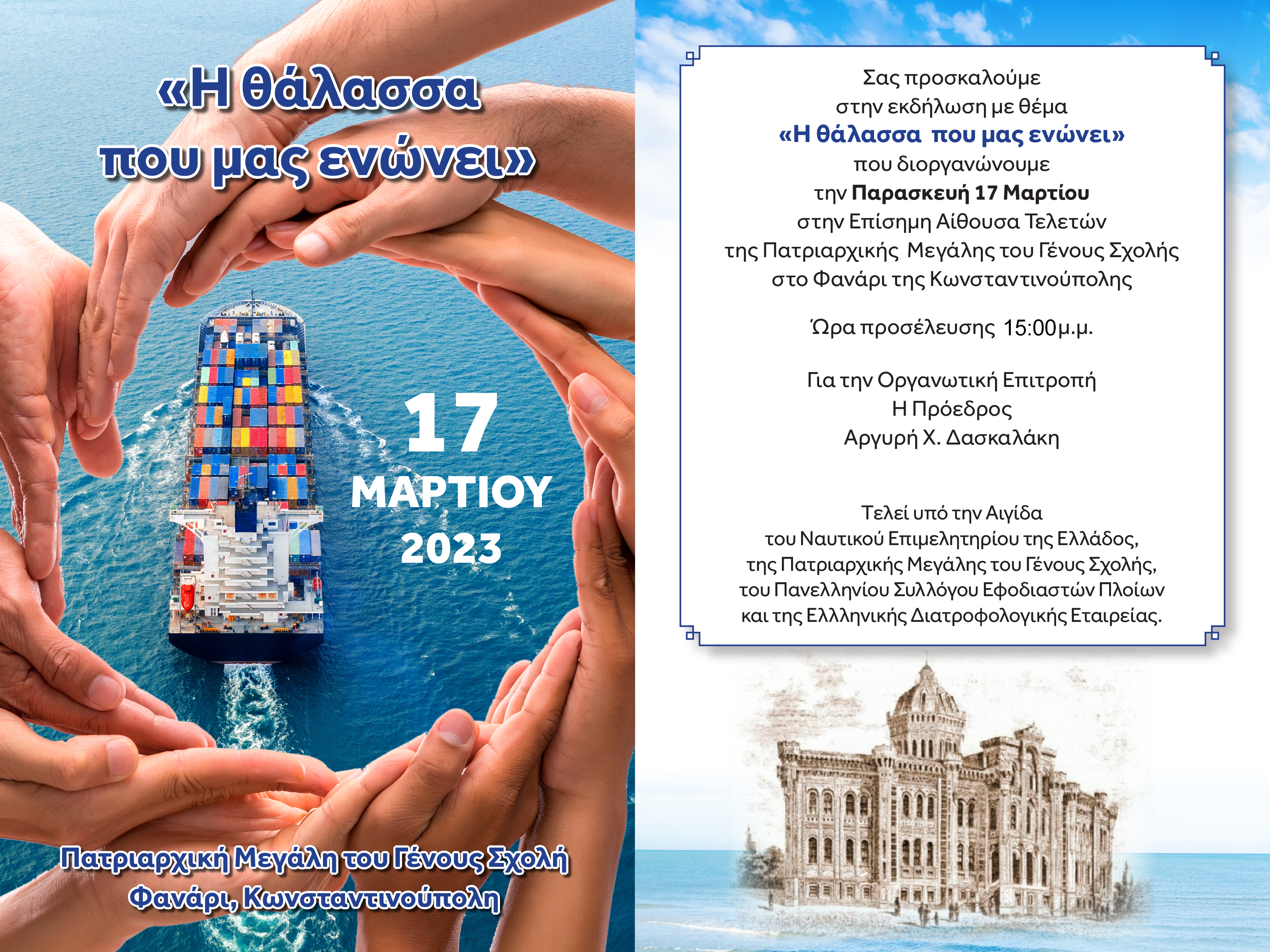 Η ως ανωτέρω εκδήλωση τελεί υπό την αιγίδα του Ναυτικού Επιμελητηρίου Ελλάδος, της Ελληνικής Διατροφολογικής Εταιρίας, της Πατριαρχικής Μεγάλης του Γένους, του Πανελληνιου Συνδέσμου Εφοδιαστών πλοίων.