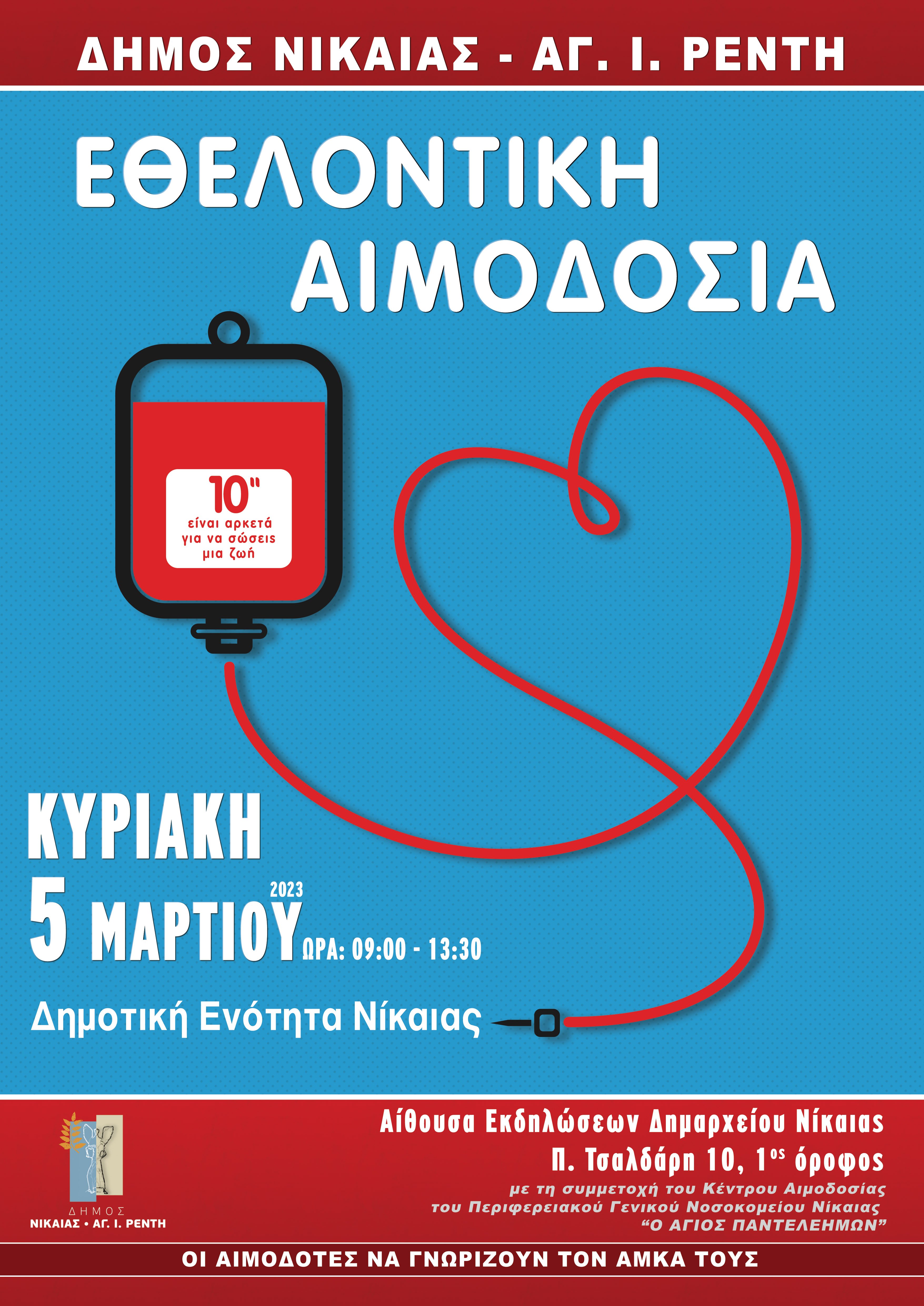 Εθελοντική αιμοδοσία διοργανώνει ο Δήμος Νίκαιας-Αγ.Ι. Ρέντη την Κυριακή 5 Μαρτίου από τις 9 το πρωί έως τη 1:30 το μεσημέρι στο Δημαρχείο Νίκαιας (Π. Τσαλδάρη 10) με τη συμμετοχή του Κέντρου Αιμοδοσίας του Περιφερειακού Γενικού Νοσοκομείου Νίκαιας “ο Άγιος Παντελεήμων”.