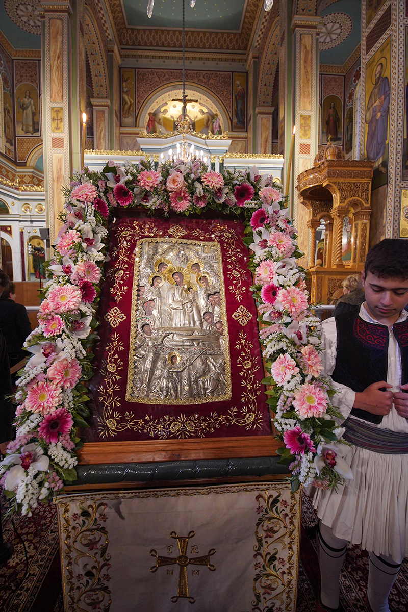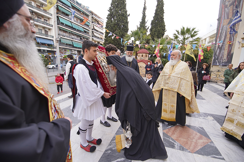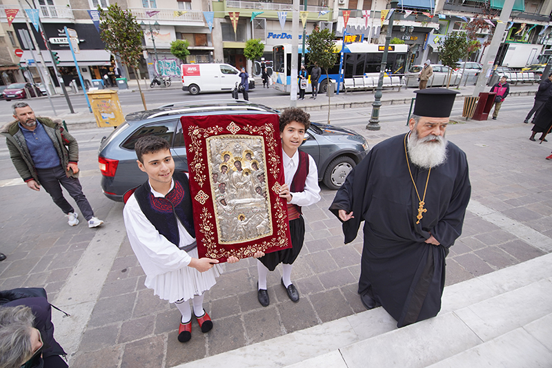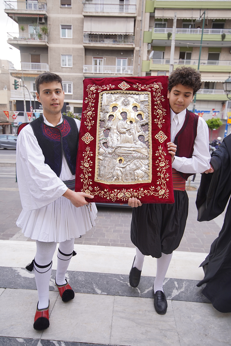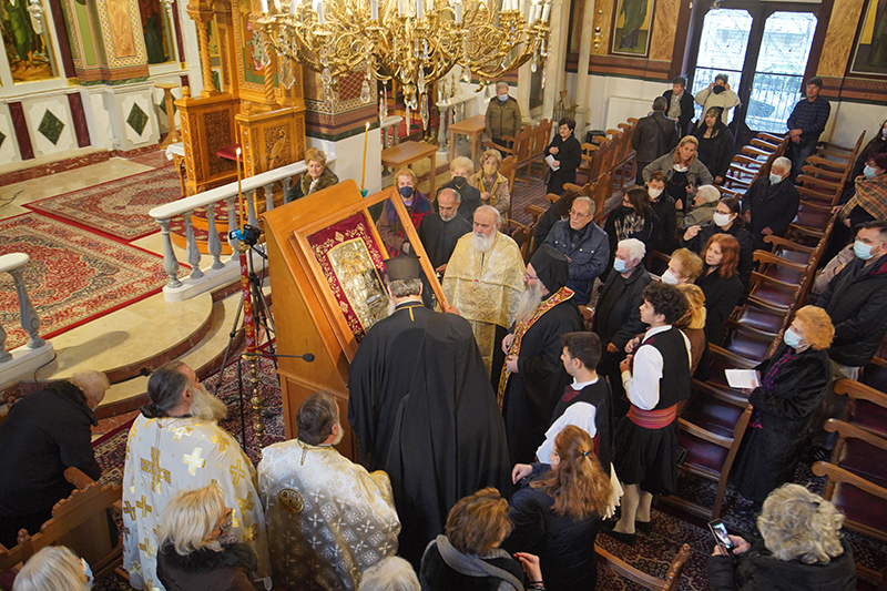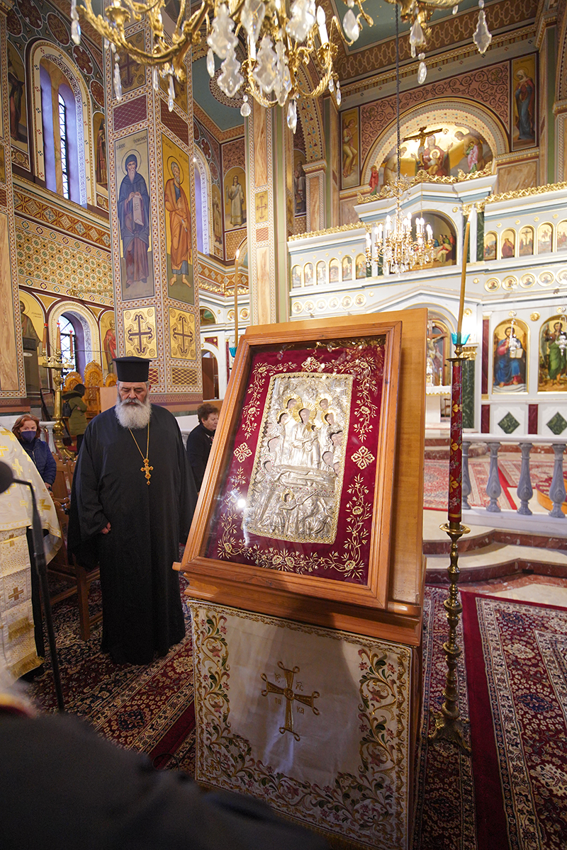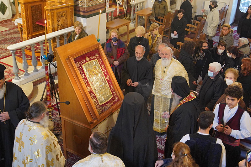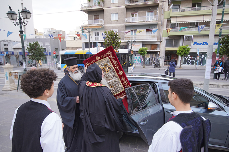 Την ιερά εφέστιο Εικόνα, που θα παραμείνει στο Ναό προς αγιασμό και στήριξη των πιστών έως το πρωί της Δευτέρας 27 Μαρτίου κόμισε ο Καθηγούμενος της Ιεράς Μονής Κοιμήσεως Θεοτόκου Άνω Ξενιάς, Αρχιμανδρίτης π. Νεκτάριος Υφαντίδης, ενώ της υποδοχής προΐστατο ο Πρωτοσύγκελος της Ιεράς Μητροπόλεως Πειραιώς, Αρχιμανδρίτης π. Νήφων Καπογιάννης.