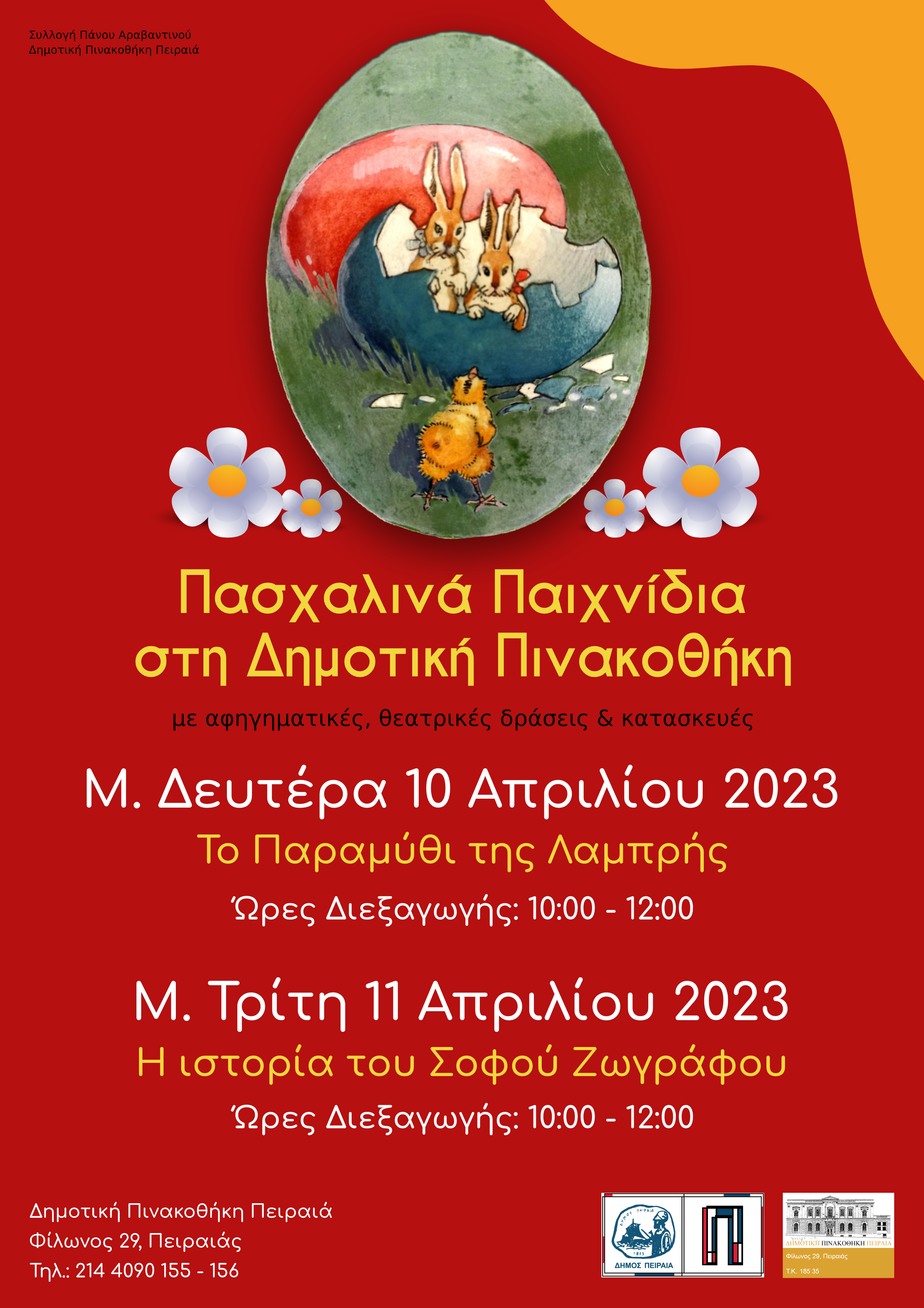 Πασχαλινά παιχνίδια με αφηγηματικές, θεατρικές δράσεις και με κατασκευές για μικρά παιδιά, διοργανώνει η Δημοτική Πινακοθήκη Πειραιά (Φίλωνος 29), τη Μ. Δευτέρα και τη Μ. Τρίτη.
