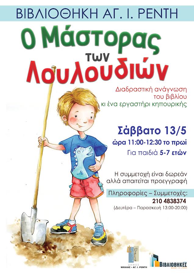 Διαδραστική ανάγνωση του βιβλίου «Ο μάστορας των λουλουδιών» κι ένα εργαστήρι κηπουρικής διοργανώνει η Δημοτική Βιβλιοθήκη Αγ.Ι. Ρέντη το Σάββατο 13 Μαϊου από τις 11 π.μ-12.30 μ.μ. στο χώρο της (Μπιχάκη 15). Μέσα από το ομότιτλο βιβλίο της Ελευθερίας Σπαντιδάκη τα παιδιά θα έχουν την δυνατότητα να γνωρίσουν τον πολύχρωμο κόσμο της κηπουρικής , να μάθουν πώς να καλλιεργούν και να φροντίζουν φυτά και λουλούδια