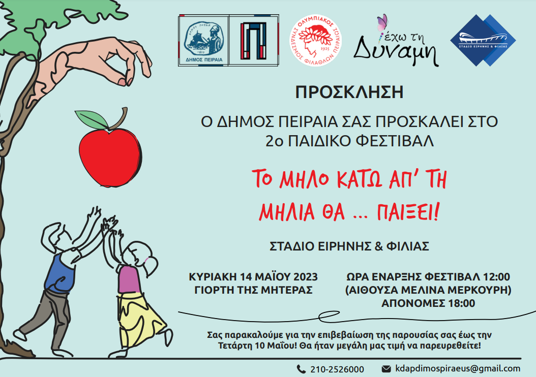 Εκδηλώσεις Εφημερίδα Πολιτισμός Ο Δ. Πειραιά σας προσκαλεί στο 2ο Παιδικό Φεστιβάλ “Το μήλο κάτω απ’ τη μηλιά θα ….παίξει!” 3 Μαΐου, 20234 Μαΐου, 2023 DIMITRIS 0 Σχόλια ΔΗΜΟΣ ΠΕΙΡΑΙΑ, ΕΧΩ ΤΗ ΔΥΝΑΜΗ, ΟΛΥΜΠΙΑΚΟΣ, ΣΤΑΔΙΟ ΕΙΡΗΝΗΣ ΚΑΙ ΦΙΛΙΑΣ Author: DIMITRIS