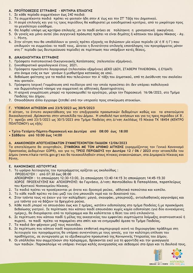 Η αίτηση, το έντυπο συγκατάθεσης για την επεξεργασία προσωπικών δεδομένων καθώς και τα απαιτούμενα δικαιολογητικά έχουν αναρτηθεί στην ιστοσελίδα του Δήμου (https://nikaia-rentis.gov.gr/%ce%ba%ce%b1%ce%bb%ce%bf%ce%ba%ce%b1%ce%af%cf%81%ce%b9-%cf%83%cf%84%ce%b7%ce%bd-%cf%80%cf%8c%ce%bb%ce%b7-%ce%bc%ce%bf%cf%85-2023-%cf%80%cf%81%cf%8c%ce%b3%cf%81%ce%b1%ce%bc%ce%bc%ce%b1-%ce%b8%ce%b5/%ce%b5%ce%bd%ce%b7%ce%bc%ce%b5%cf%81%cf%89%cf%83%ce%b7/)