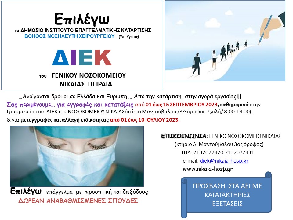 Εφημερίδα Παιδεία Πολιτική - Επικαιρότητα Υγεία Δημόσιο Ινστιτούτο Επαγγελματικής Κατάρτισης ΔΙΕΚ Βοηθός Νοσηλευτή Χειρουργείου 8 Ιουνίου, 2023 DIMITRIS 0 Σχόλια ΝΟΣΟΚΟΜΕΙΟ ΝΙΚΑΙΑΣ Author: DIMITRIS