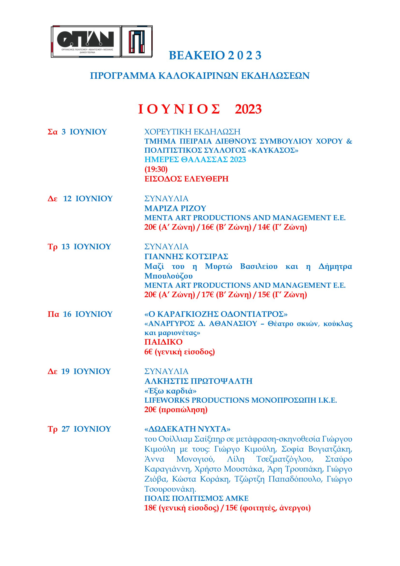 Για ακόμα ένα καλοκαίρι υποδέχεται ο Πειραιάς τις καλλιτεχνικές εκδηλώσεις στο Βεάκειο Θέατρο, οι οποίες αποτελούν έναν σημαντικό πολιτιστικό θεσμό για την πόλη μας και περιλαμβάνουν συναυλίες με δημοφιλείς καλλιτέχνες, μουσικοχορευτικές παραστάσεις, παιδικό θέατρο, παραστάσεις αρχαίου δράματος και εκδηλώσεις από συλλόγους και φορείς του Πειραιά.