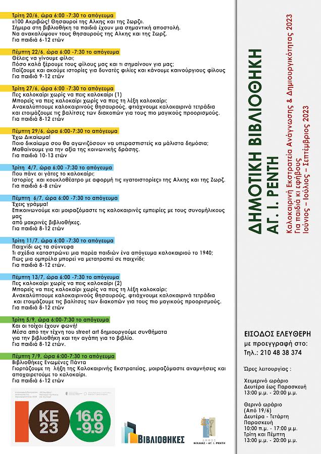 Η Δημοτική Βιβλιοθήκη Αγ.Ι. Ρέντη συμμετέχει στην Καλοκαιρινή Εκστρατεία Ανάγνωσης και Δημιουργικότητας της Εθνικής Βιβλιοθήκης της Ελλάδος με τίτλο   «100 ακριβώς! Θησαυροί της Άλκης και της Ζωρζ…». Οι μικροί βιβλιόφιλοι θα έχουν την ευκαιρία να συμμετέχουν σε δημιουργικές και παιγνιώδεις δραστηριότητες βασισμένες σε θέματα όπως η ιστορία, τα συνθήματα, τα ταξίδια, οι καλοκαιρινές μας συναντήσεις, δράσεις που συνδέονται με έργα των δύο συγγραφέων: της Άλκης Ζέη και της Ζώρζ Σαρή. Η Καλοκαιρινή Εκστρατεία  στη Δημοτική Βιβλιοθήκη Αγ.Ι. Ρέντη θα ξεκινήσει στις  20 Ιουνίου και θα ολοκληρωθεί στις 7 Σεπτεμβρίου στο χώρο της βιβλιοθήκης (Μπιχάκη 15). Απευθύνεται σε παιδιά ηλικίας 6-12 ετών.