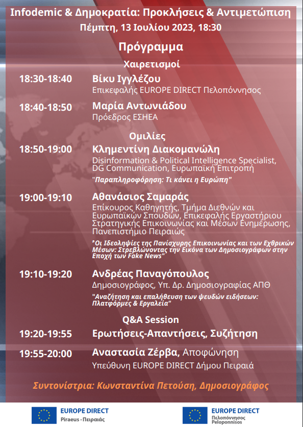 Εκ μέρους των EUROPE DIRECT Δήμου Πειραιά και Πελοποννήσου σας αποστέλλουμε την πρόσκληση και το πρόγραμμα για τη διαδικτυακή εκδήλωση με τίτλο «Infodemic & Δημοκρατία: Προκλήσεις και Αντιμετώπιση» που θα πραγματοποιηθεί την Πέμπτη 13 Ιουλίου και ώρα 18:30