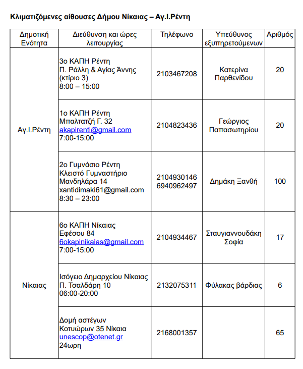 Ακολουθεί πίνακας με τους διαθέσιμους κλιματιζόμενους χώρους στον Δήμο Νίκαιας – Αγ.Ι. Ρέντη: