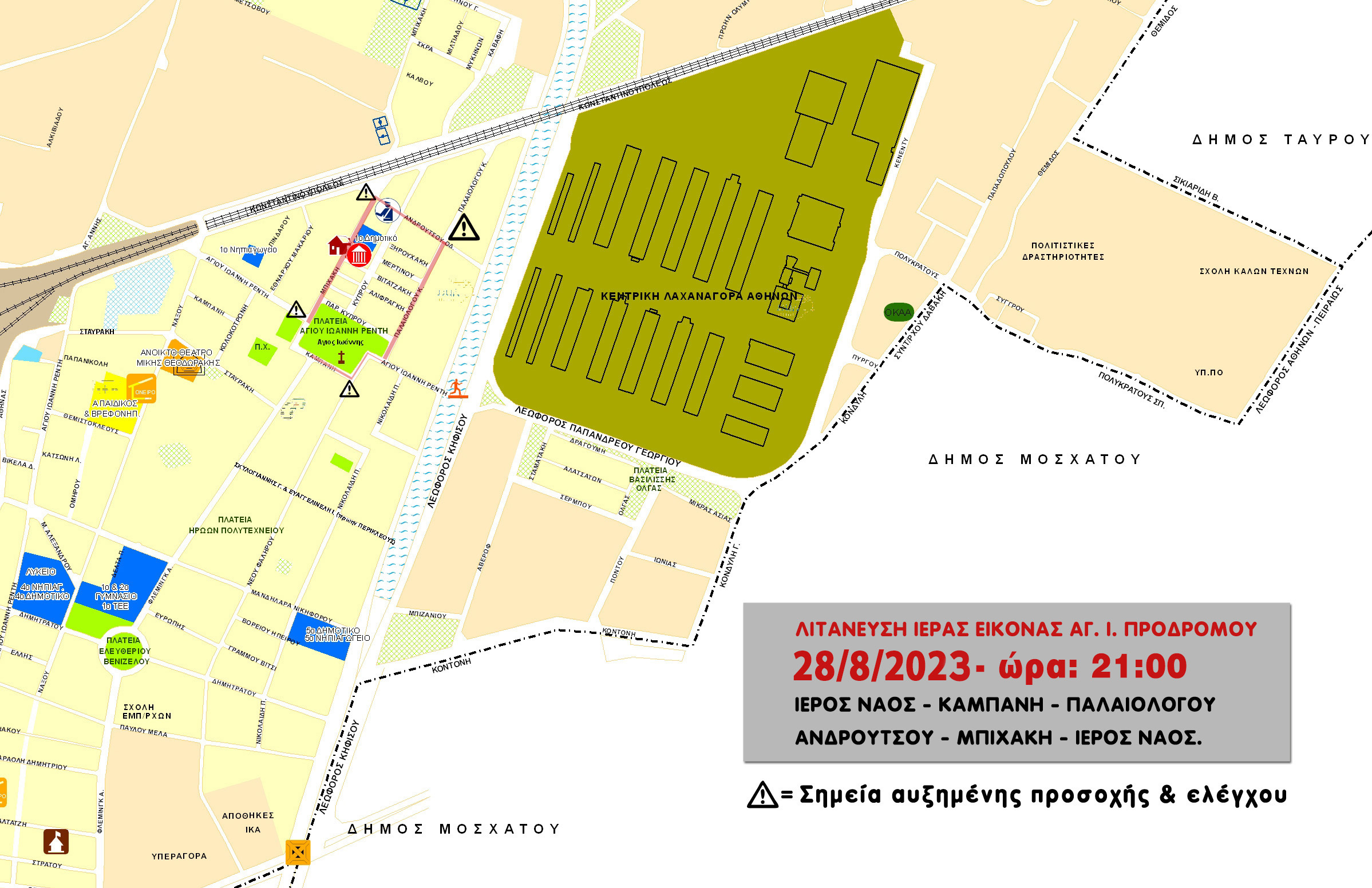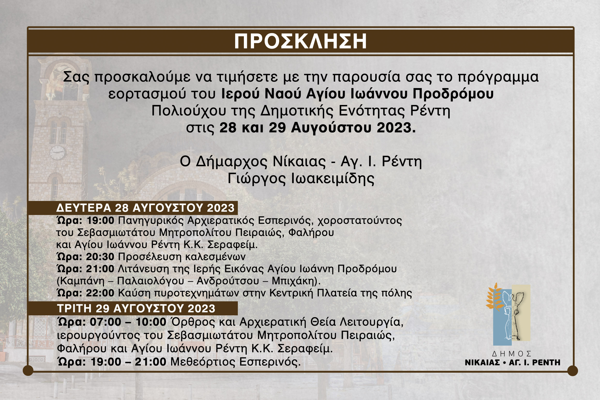 Δευτέρα 28 Αυγούστου 2023 στις 7 το απόγευμα Πανηγυρικός Αρχιερατικός Εσπερινός, χοροστατούντος του Σεβασμιωτάτου Μητροπολίτου Πειραιώς, Φαλήρου και Αγίου Ιωάννη Ρέντη κ.κ. Σεραφείμ στις 8:30 το βράδυ Προσέλευση καλεσμένων στις 9 το βράδυ Λιτάνευση της Ιερής Εικόνας Αγίου Ιωάννη Προδρόμου