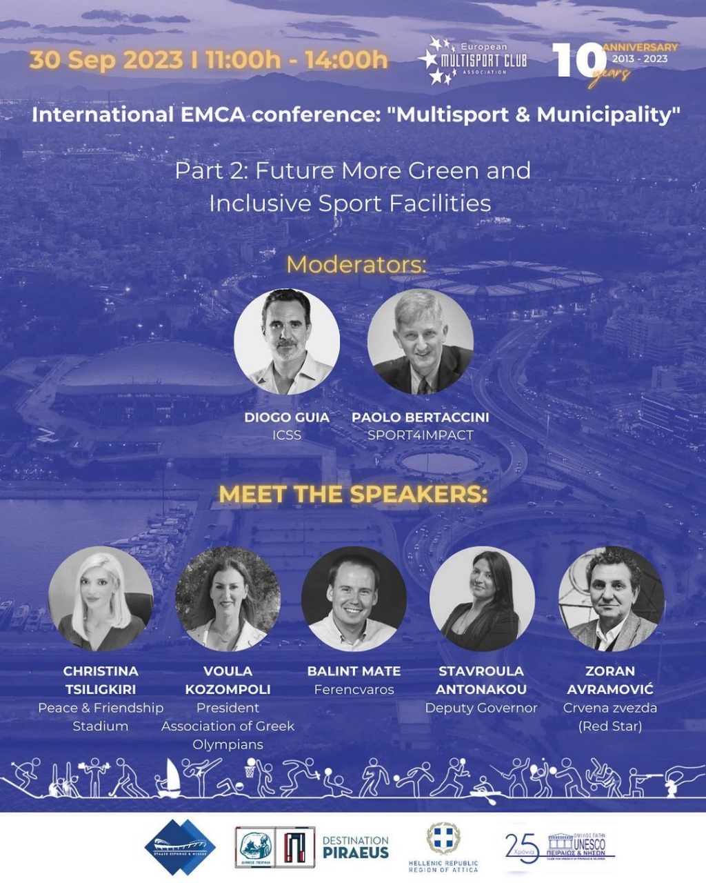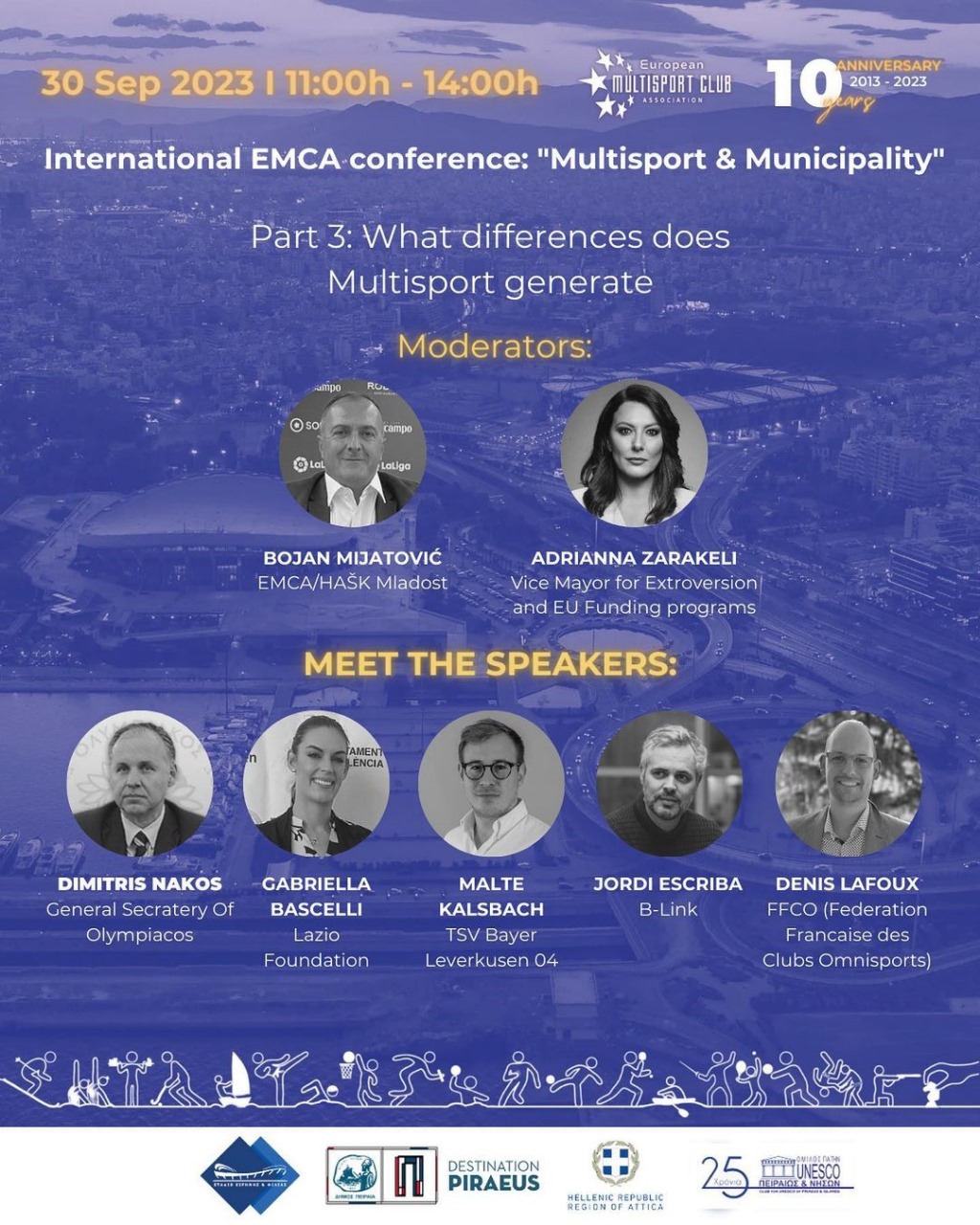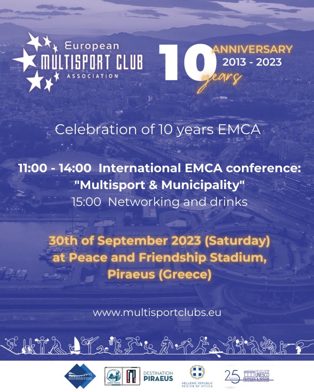 Η Ευρωπαϊκή Ένωση Πολυαθλητικών Σωματείων (EMCA) πραγματοποιεί στην αίθουσα «Μελίνα Μερκούρη» Συνέδριο με θέμα «Πολυαθλητισμός και τοπική αυτοδιοίκηση». Το Σάββατο 30 Σεπτεμβρίου, από τις 11.00 έως τις 14.00. Σε συνεργασία με τον Ολυμπιακό ΣΦΠ και το Στάδιο Ειρήνης και Φιλίας.