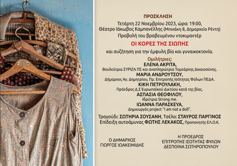 H προβολή του βραβευμένου ντοκιμαντέρ ΟΙ ΚΟΡΕΣ ΤΗΣ ΣΙΩΠΗΣ της Δέσποινας Σωτηροπούλου (δημοσιογράφος-σκηνοθέτης) θα πραγματοποιηθεί την Τετάρτη 22 Νοεμβρίου στις 7 το απόγευμα στο Θέατρο Ιάκωβος Καμπανέλλης (Δημαρχείο Ρέντη,Μπιχάκη 8). Η προβολή πραγματοποιείται με αφορμή την 25η Νοεμβρίου Παγκόσμια Ημέρα κατά της Βίας των Γυναικών.