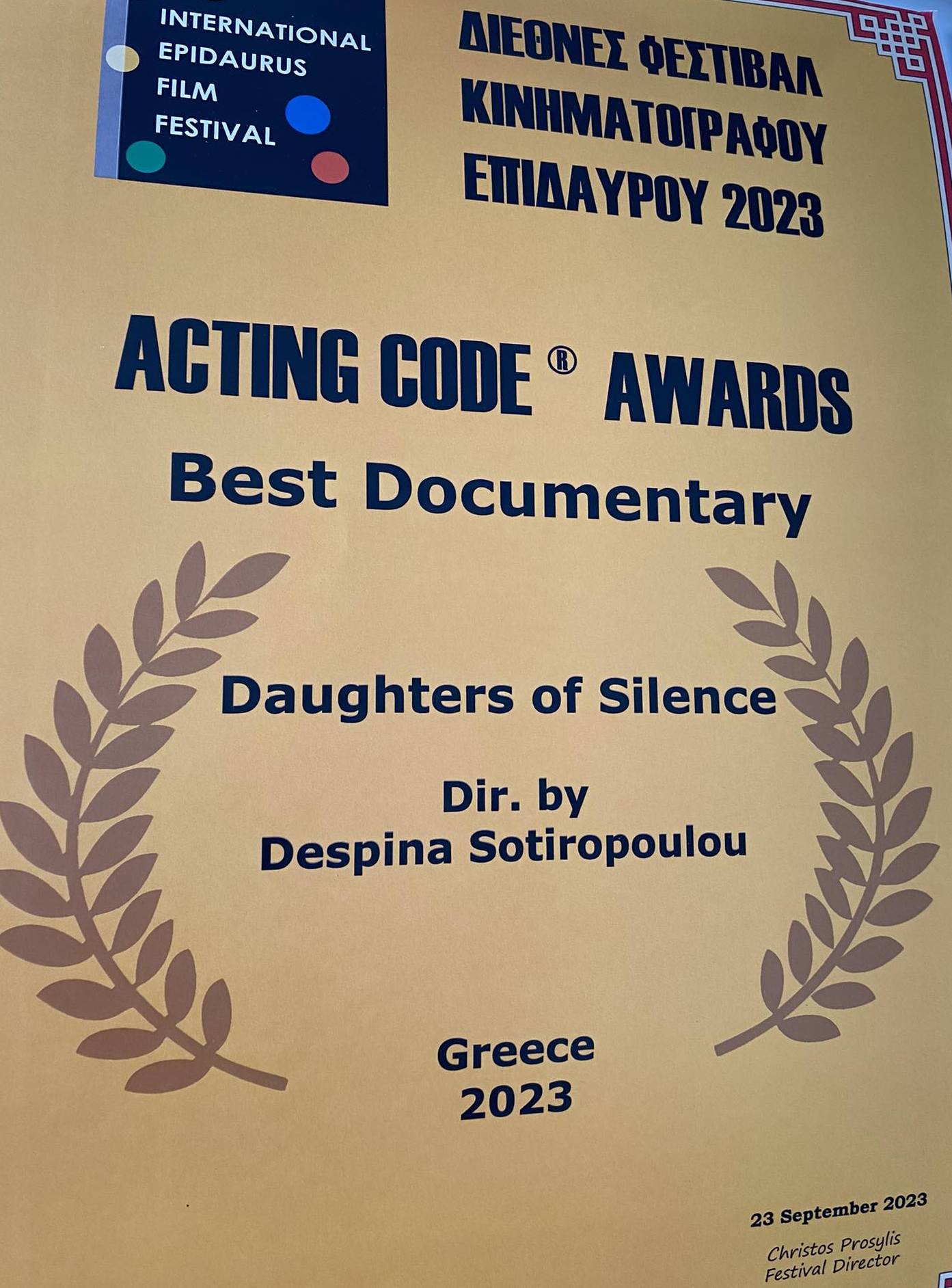 Αξίζει να σημειωθεί ότι ΟΙ ΚΟΡΕΣ ΤΗΣ ΣΙΩΠΗΣ- “DAUGHTERS OF SILENCE” διακρίθηκαν με το Βραβείο καλύτερου ντοκιμαντέρ “best documentary acting code awards” στο 2ο Διεθνές Φεστιβάλ Επιδαύρου “International Epidaurus Film Festival” που τελεί υπό την ομπρέλα του “Ιnternational Film Festival of London” και του “Acting Code Institut of London”. Το ντοκιμαντέρ μέσα από προσωπικές μαρτυρίες γυναικών που βίωσαν τη βαρβαρότητα, την τρομοκρατία, το φόβο και την εγκατάλειψη διεισδύει στην ανισότητα των Φύλων, την έμφυλη βία, τη γυναικοκτονία και τις θέσεις της Πολιτείας, του Δικαίου και της Εκκλησίας. Με κινηματογραφική και δραματουργική απόδοση της τραγικής αλήθειας καταγράφονται τα υψηλά ποσοστά της ενδοοικογενειακής βίας, της κακοποίησης και δολοφονίας των γυναικών καθώς και τα αναπάντητα ερωτήματα, όπως: Πως προστατεύει το κράτος τη μητέρα και τα παιδιά της από τους κακοποιητές; Πως περιθάλπει τα θύματα που τερματίζουν την ανοχή και τη σιωπή τους; Ποια η προστασία του Νομικού συστήματος; Γιατί η κακοποίηση δεν έχει τέλος;