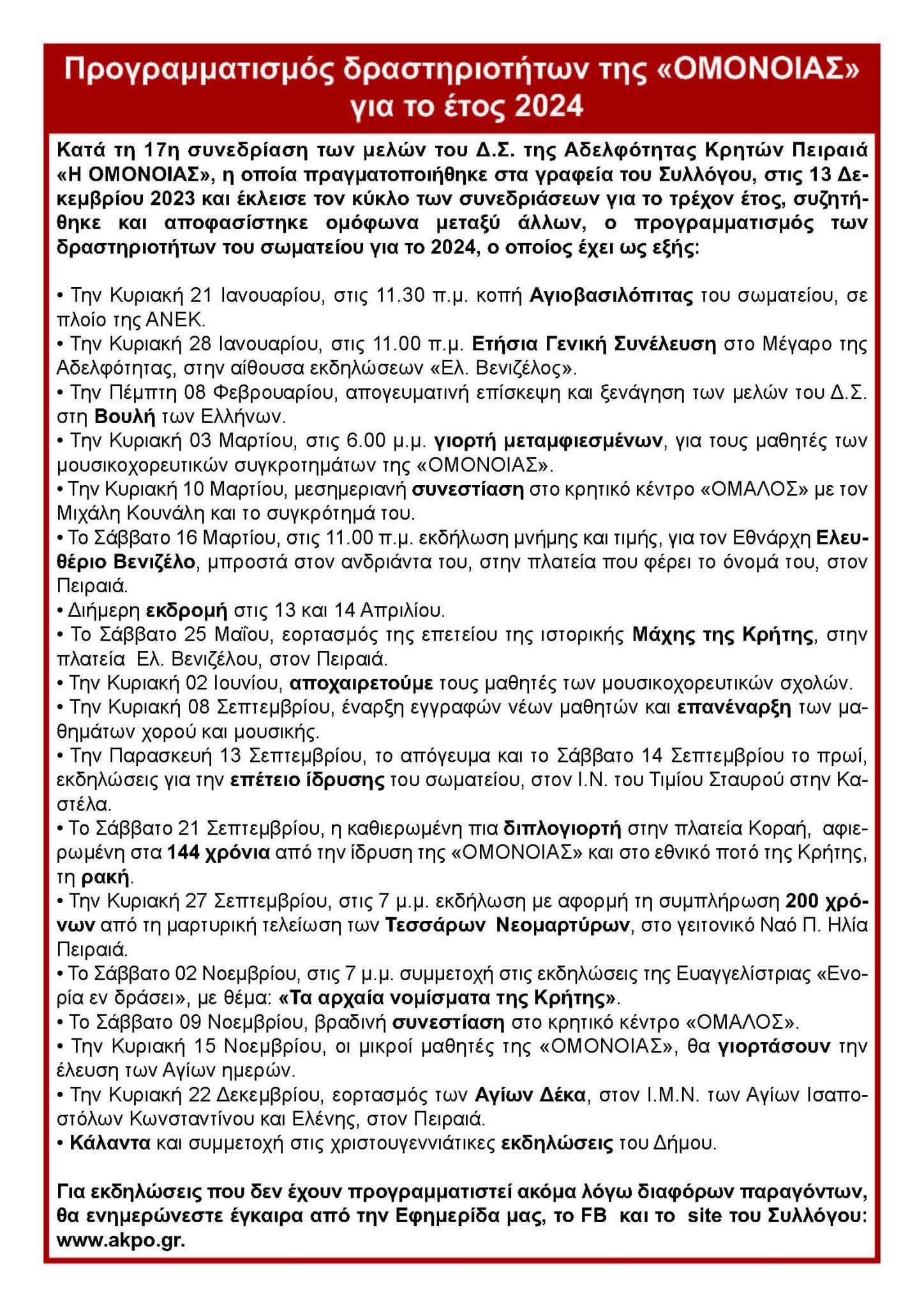 Εκδηλώσεις Εφημερίδα Πολιτισμός Προγραμματισμός δραστηριοτήτων της “ΟΜΟΝΟΙΑΣ” για το έτος 2024 3 Ιανουαρίου, 20243 Ιανουαρίου, 2024 DIMITRIS2890 0 Σχόλια ΑΔΕΛΦΟΤΗΤΑ ΚΡΗΤΩΝ ΠΕΙΡΑΙΑ, ΟΜΟΝΟΙΑ, ΤΣΟΝΤΟΣ