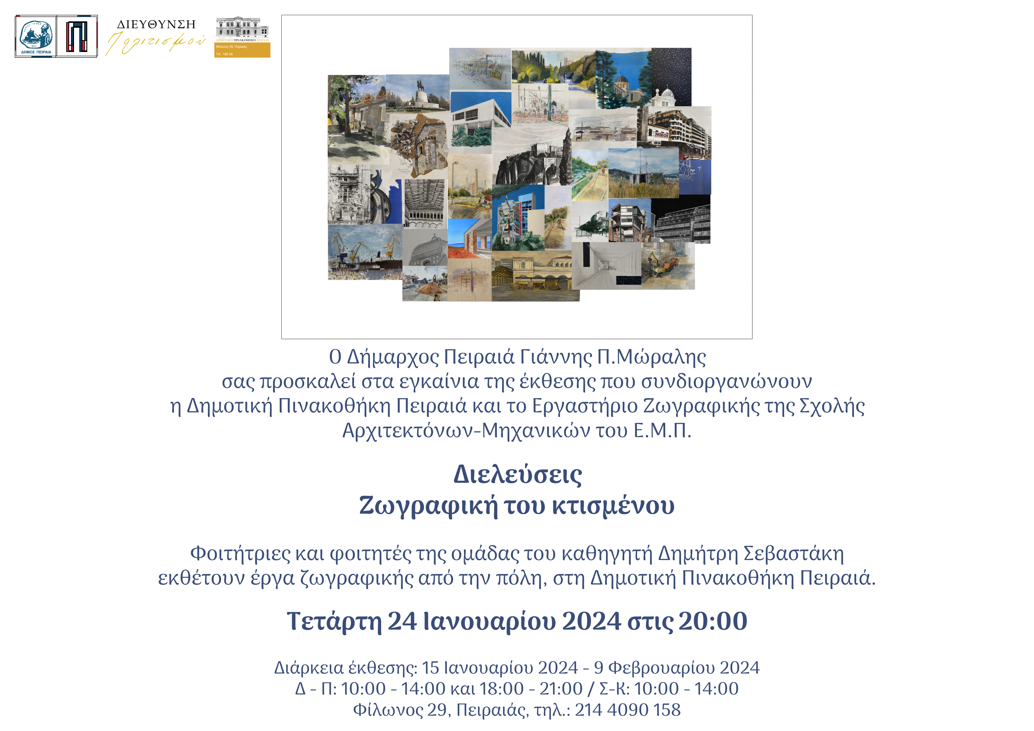 Εκδηλώσεις Εφημερίδα Πολιτισμός Έκθεση Ζωγραφικής: Διελεύσεις. Η ζωγραφική του κτισμένου 19 Ιανουαρίου, 2024 DIMITRIS 0 Σχόλια ΔΗΜΟΤΙΚΗ ΠΙΝΑΚΟΘΗΚΗ, ΕΚΘΕΣΗ, ΖΩΓΡΑΦΙΚΗ Author: DIMITRIS