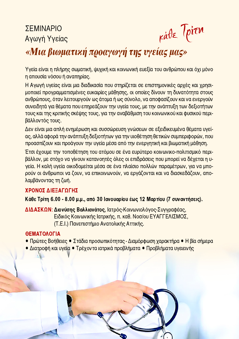 Τη φετινή χρονιά θα πραγματοποιηθούν τέσσερα Σεμινάρια, διάρκειας επτά εβδομάδων.