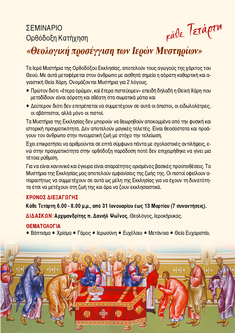 Πληροφορίες: Πνευματικό Κέντρο Ευαγγελιστρίας, Τηλ.: 210 4125619.
