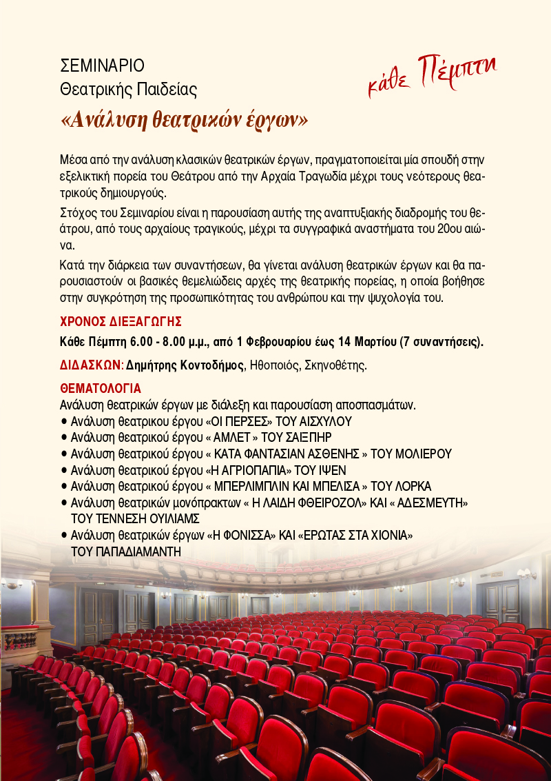 3. «Ανάλυση θεατρικών έργων» Μέσα από την ανάλυση κλασικών θεατρικών έργων, πραγματοποιείται μία σπουδή στην εξελικτική πορεία του Θεάτρου από την Αρχαία Τραγωδία μέχρι τους νεότερους θεατρικούς δημιουργούς.