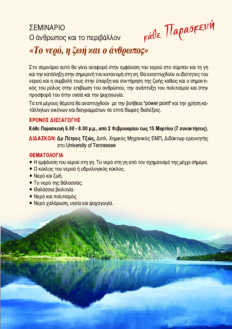 4. «Το νερό, η ζωή και ο άνθρωπος» Στο σεμινάριο αυτό θα γίνει αναφορά στην εμφάνιση του νερού στο σύμπαν και τη γη και την κατάληξη στην σημερινή του κατανομή στη γη.