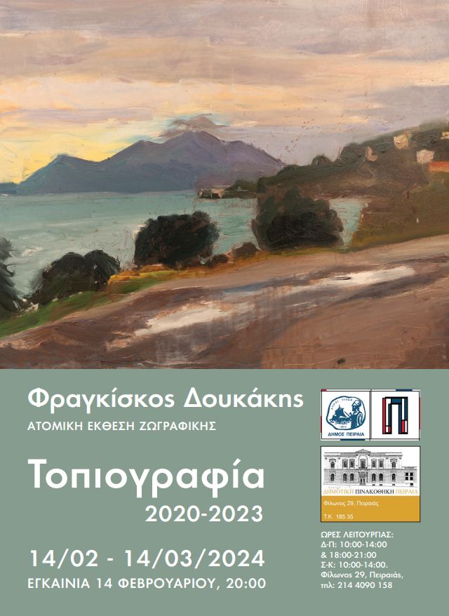 Η Δημοτική Πινακοθήκη Πειραιά παρουσιάζει την ατομική έκθεση ζωγραφικής του Φραγκίσκου Δουκάκη, με τίτλο «Τοπιογραφία 2020-2023», από την Τετάρτη 14 Φεβρουαρίου 2024 έως 14 Μαρτίου 2024.