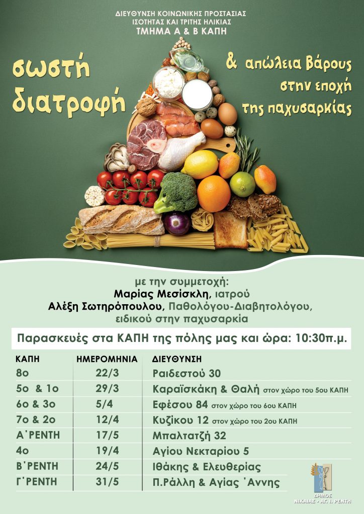 Μια σειρά ενημερωτικών δράσεων για τη «Σωστή Διατροφή & Απώλεια Βάρους στην εποχή της παχυσαρκίας» πραγματοποιεί ο Δήμος Νίκαιας-Αγ.Ι.Ρέντη κάθε Παρασκευή στα ΚΑΠΗ της πόλης από τις 22 Μαρτίου έως τις 31 Μαϊου, στις 10.30 το πρωί με είσοδο ελεύθερη. Τη διοργάνωση έχει αναλάβει η Διεύθυνση Κοινωνικής Προστασίας Ισότητας και Τρίτης Ηλικίας με ομιλητές τους Μαρία Μεσίσκλη ιατρός και Αλέξης Σωτηρόπουλος , Παθολόγος- Διαβητολόγος ειδικός στην παχυσαρκία.