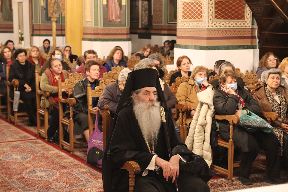 Έχουμε την μεγάλη ευλογία, τόνισε ο Σεβασμιώτατος, στο Ναό της Ευαγγελιστρίας, με την ποιμαντική μέριμνα και ευθύνη του π. Γεωργίου Γεωργακόπουλου και των συνεφημερίων του, να υψώνουμε το ανθρώπινο πρόσωπο, που δεν είναι μία τυχαία συνάρτηση κυττάρων, αλλά μία απερινόητη σοφία και υπερμαθηματικής τελειότητος σύνθεση και αρμονική συνάρμοση πολυειδών οργάνων, που όλα όμως άρχονται και τελειούνται στον έσω άνθρωπο, που είναι αθάνατη ψυχή, εικόνα του Δημιουργού του.