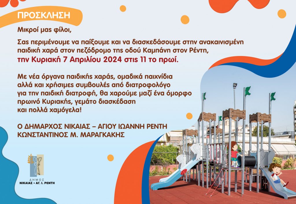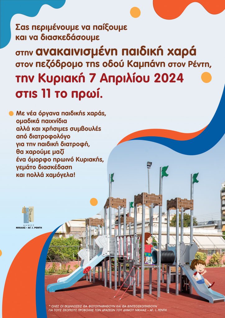 Στον πεζόδρομο της οδού Καμπάνη, δίπλα από την κεντρική πλατεία Ρέντη, ο Δήμος Νίκαιας-Αγ.Ι. Ρέντη ολοκλήρωσε τα έργα ανακαίνισης της παιδικής χαράς και την εγκαινιάζει την Κυριακή 7 Απριλίου στις 11 το πρωί. Η Διεύθυνση Αθλητισμού έχει ετοιμάσει ένα πρόγραμμα δραστηριοτήτων με παιχνίδια της γειτονιάς και η Διατροφολόγος Κατερίνα Χατζήρη θα δώσει χρήσιμες συμβουλές για την παιδική διατροφή αφού τυχαίνει αυτή η μέρα να είναι και Παγκόσμια Ημέρα Υγείας.