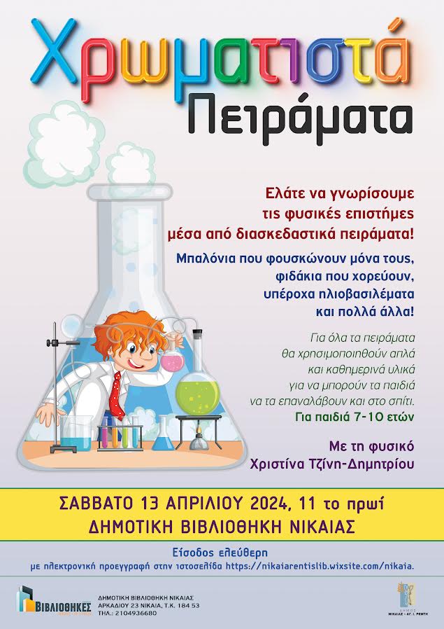 Μπαλόνια που φουσκώνουν μόνα τους, φιδάκια που χορεύουν, υπέροχα ηλιοβασιλέματα και πολλά άλλα έχει ετοιμάσει η Δημοτική Βιβλιοθήκη Νίκαιας με τα «Χρωματιστά Πειράματα». Η δράση θα πραγματοποιηθεί το Σάββατο 13 Απριλίου στο χώρο της βιβλιοθήκης (Αρκαδίου 23) στις 11 το πρωί και απευθύνεται σε παιδιά ηλικίας 7-10 ετών. Η φυσικός Χριστίνα Τζίνη –Δημητρίου θα γνωρίσει στα παιδιά τις φυσικές επιστήμες «αλλιώς». Για όλα τα πειράματα θα χρησιμοποιηθούν απλά και καθημερινά υλικά για να μπορούν τα παιδιά να τα επαναλάβουν και στο σπίτι.