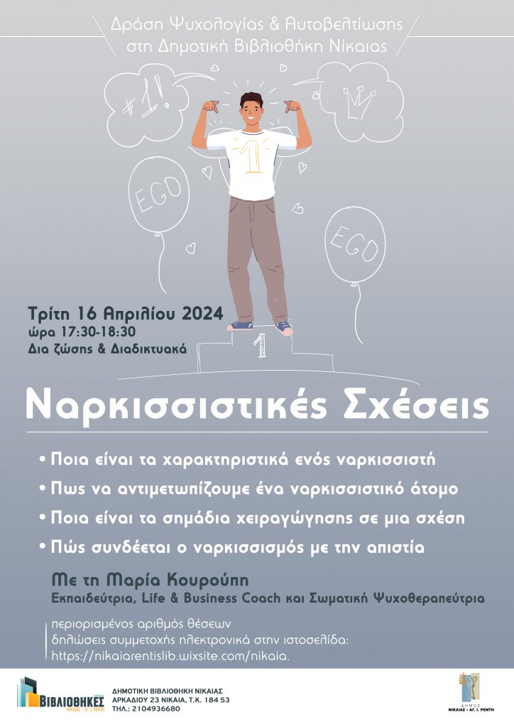 Στο πλαίσιο των δράσεων Ψυχολογίας & Αυτοβελτίωσης που διοργανώνει η Δημοτική Βιβλιοθήκη Νίκαιας (Αρκαδίου 23) θα πραγματοποιηθεί ομιλία με θέμα Ναρκισσιστικές Σχέσεις , την Τρίτη 16 Απριλίου στις 5. 30 μ.μ. Η Μαρία Κουρούπη Εκπαιδεύτρια, Life & Business Coach και Σωματική Ψυχοθεραπεύτρια θα δώσει απαντήσεις στα παρακάτω ερωτήματα: