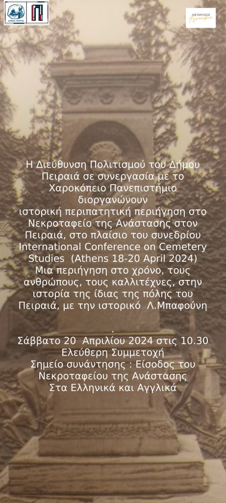 Η Διεύθυνση Πολιτισμού του Δήμου Πειραιά σε συνεργασία με το Χαροκόπειο Πανεπιστήμιο διοργανώνουν ιστορική περιπατητική περιήγηση στο Νεκροταφείο της Ανάστασης στον Πειραιά, στο πλαίσιο του συνεδρίου International Conference on Cemetery Studies (Athens 18-20 April 2024)