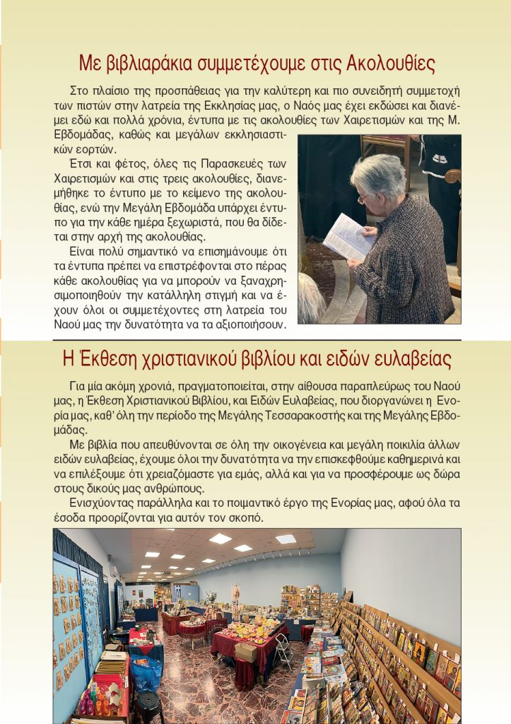 Έτσι και φέτος, όλες τις Παρασκευές των Χαιρετισμών και στις τρεις ακολουθίες, διανεμήθηκε το έντυπο με το κείμενο της ακολουθίας, ενώ την Μεγάλη Εβδομάδα υπάρχει έντυπο για την κάθε ημέρα ξεχωριστά, που θα δίδεται στην αρχή της ακολουθίας.