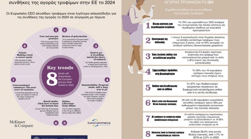 Σύμφωνα με τα αποτελέσματα της έρευνας, το 70% των ευρωπαϊκών επιχειρήσεων τροφίμων αναφέρει την αντιμετώπιση της πίεσης κόστους και περιθωρίου κέρδους ως κορυφαία προτεραιότητα μεταξύ των οκτώ βασικών τάσεων. Η επιστροφή της πόλωσης είναι η δεύτερη τάση, με 1 στους 5 καταναλωτές στην Ευρώπη να σκοπεύει να αλλάξει κατάστημα τροφίμων τους επόμενους 3 μήνες, ενώ 1 στους 2 συνεχίζει να αναζητά τρόπους εξοικονόμησης χρημάτων. Ο αγώνας πάλης για το μεγαλύτερο μερίδιο φαγητού στο στομάχι θα συνεχιστεί, ενώ αναμένεται 2,5 φορές ταχύτερη ανάπτυξη στο φαγητό που καταναλώνεται μακριά από το σπίτι, έναντι της συνολικής κατανάλωσης. Στη βιωσιμότητα σημειώθηκε πρόοδος, αλλά υπάρχει πολύς δρόμος ακόμα, αφού μόνο το 29% των 10 κορυφαίων επιχειρήσεων λιανικής έχουν επιτύχει τους στόχους τους. Το «online» είναι η απελευθέρωση από το «offline», με το 37% των διαδικτυακών αγοραστών να πηγαίνουν σε διαφορετικά καταστήματα online από ό,τι εκτός σύνδεσης. Οι καταναλωτές «κάνουν κλικ» στα κοινωνικά δίκτυα, με 20 από τα 30 κορυφαίες ευρωπαϊκές αλυσίδες τροφίμων να έχουν ήδη μια καθιερωμένη επιχείρηση κοινωνικών μέσων της λιανικής τους πώλησης. Το «συνομιλητικό εμπόριο» φέρνει το επόμενο κύμα αναλυτικών στοιχείων, ενώ οι πολλά υποσχόμενες περιπτώσεις χρήσης τεχνητής νοημοσύνης μπορούν να ξεκλειδώσουν το 10-20% της αξίας των προηγμένων αναλυτικών στοιχείων με ΑΙ. Τέλος, η όγδοη τάση είναι να γίνει ξανά το λιανικό εμπόριο μια απασχόληση με ταλέντο και δεξιότητες, μετά και την αύξηση το 2024 κατά 29,4% στις κενές θέσεις εργασίας, από 2,2% το 2023. Σε γενικές γραμμές, οι CEO των μεγάλων αλυσίδων τροφίμων είναι λιγότερο απαισιόδοξοι για τις συνθήκες της αγοράς το 2024, σε σύγκριση με πέρυσι και διακρίνουν σημάδια ελπίδας.