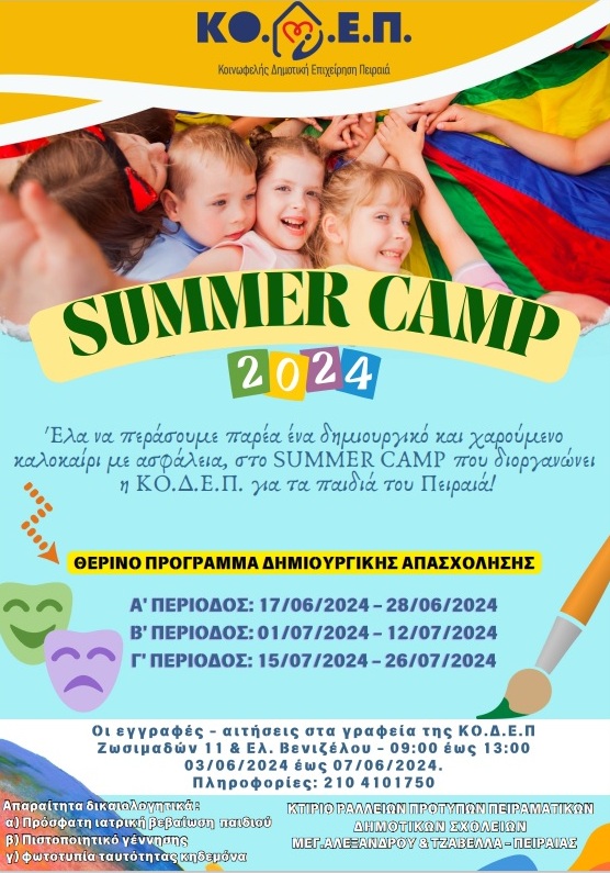 Η Κοινωφελής Δημοτική Επιχείρηση Πειραιά διοργανώνει και εφέτος το καθιερωμένο Summer Camp για παιδιά από 6 έως 14 ετών, το οποίο θα υλοποιηθεί από 17 Ιουνίου έως 26 Ιουλίου 2024, στο κτήριο των Ραλλείων Πρότυπων Πειραματικών Δημοτικών Σχολείων.
